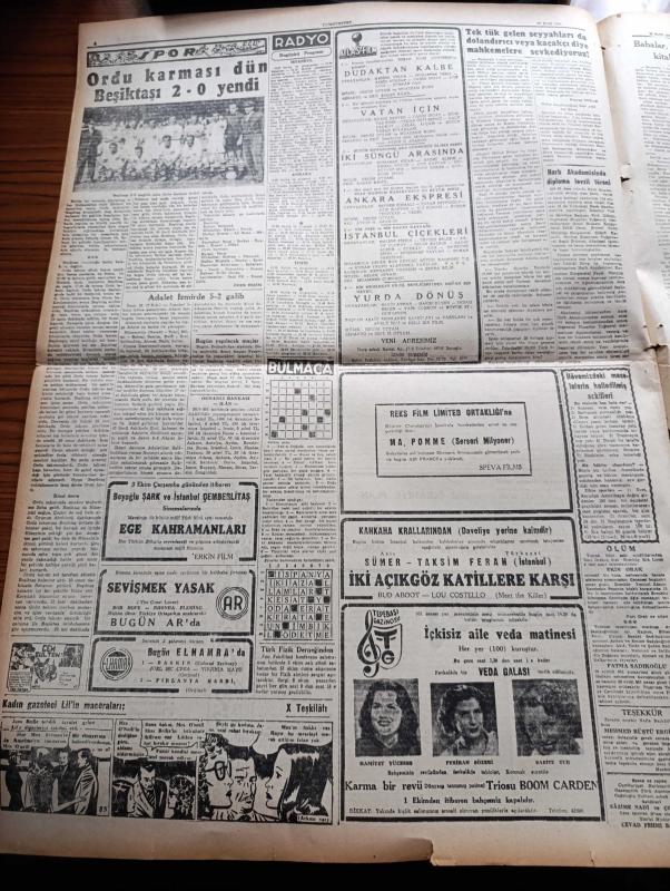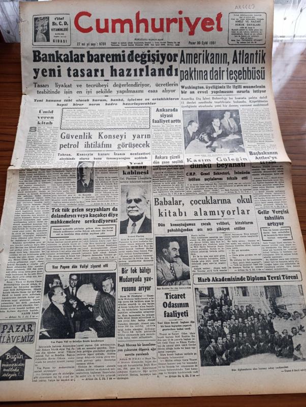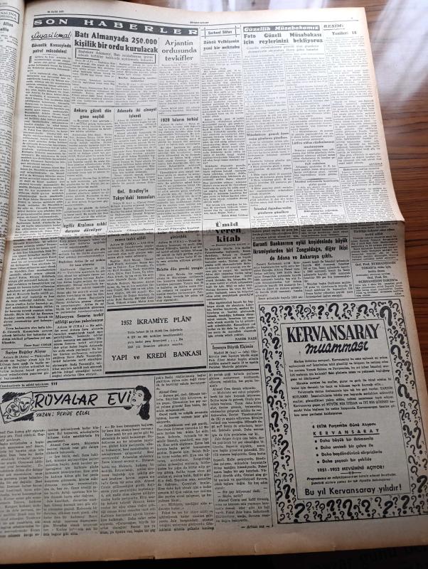 Cumhuriyet Gazetesi - 30 Eylül 1951 - Ümit Veren Kitap Yazan Nadir Nadi Köşe Yazısı - Bankalar Baremi Değişiyor Yeni Tasarı Hazırlandı - Güvenlik Konseyi Yarın Petrol İhtilafını Görüşecek - Almanya'nın Eski Ankara Büyükelçisi Von Papen İstanbul Valisi Fahrettin Kerim Gökay'ı Ziyaret Etti - Amerika'nın Atlantik Paktına Dair Teşebbüsü - Kasım Güleğin Dünkü Beyanatı - Babalar Çocuklarına Okul Kitabı Alamıyorlar - Harb Akademisinde Diploma Tevzi Töreni - Haftanın Şakaları Yazan Burhan felek - Dedikodu Yazan Falih Rıfkı Atay - Parmak İzi Nasıl Bulundu - Rüyalar Evi Yazan Peride Celal Yazı Dizisi - Batı Almanya'da 250.000 Kişilik Bir Ordu Kurulacak - Ordu Karması Dün Beşiktaş'ı 2 0 Yendi - Kadın Gazeteci Lil'in Maceraları Çizgi Roman - Dolmabahçe Stadında Ordu Muhteliti İle Fenerbahçe Maçı - Opon Ağrı Kesici - Hamiyet Yüceses Perihan Sözeri Ve Sabite Tur Tepebaşı Gazinosunda - Nevrozin Ağrı Kesici - Jeep - Easy Çamaşır Yıkama Ve Kurutma makinesi - Odeon Mağazaları - Zehra Bilir Beyaz Parkta, Yunus Nadi tarafından kaleme alınmıştır. Cumhuriyet Gazetesi - 30 Eylül 1951 - Ümit Veren Kitap Yazan Nadir Nadi Köşe Yazısı - Bankalar Baremi Değişiyor Yeni Tasarı Hazırlandı - Güvenlik Konseyi Yarın Petrol İhtilafını Görüşecek - Almanya'nın Eski Ankara Büyükelçisi Von Papen İstanbul Valisi Fahrettin Kerim Gökay'ı Ziyaret Etti - Amerika'nın Atlantik Paktına Dair Teşebbüsü - Kasım Güleğin Dünkü Beyanatı - Babalar Çocuklarına Okul Kitabı Alamıyorlar - Harb Akademisinde Diploma Tevzi Töreni - Haftanın Şakaları Yazan Burhan felek - Dedikodu Yazan Falih Rıfkı Atay - Parmak İzi Nasıl Bulundu - Rüyalar Evi Yazan Peride Celal Yazı Dizisi - Batı Almanya'da 250.000 Kişilik Bir Ordu Kurulacak - Ordu Karması Dün Beşiktaş'ı 2 0 Yendi - Kadın Gazeteci Lil'in Maceraları Çizgi Roman - Dolmabahçe Stadında Ordu Muhteliti İle Fenerbahçe Maçı - Opon Ağrı Kesici - Hamiyet Yüceses Perihan Sözeri Ve Sabite Tur Tepebaşı Gazinosunda - Nevrozin Ağrı Kesici - Jeep - Easy Çamaşır Yıkama Ve Kurutma makinesi - Odeon Mağazaları - Zehra Bilir Beyaz Parkta adlı eser Türkçe dilindedir.
