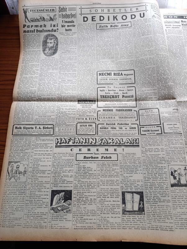 Cumhuriyet Gazetesi - 30 Eylül 1951 - Ümit Veren Kitap Yazan Nadir Nadi Köşe Yazısı - Bankalar Baremi Değişiyor Yeni Tasarı Hazırlandı - Güvenlik Konseyi Yarın Petrol İhtilafını Görüşecek - Almanya'nın Eski Ankara Büyükelçisi Von Papen İstanbul Valisi Fahrettin Kerim Gökay'ı Ziyaret Etti - Amerika'nın Atlantik Paktına Dair Teşebbüsü - Kasım Güleğin Dünkü Beyanatı - Babalar Çocuklarına Okul Kitabı Alamıyorlar - Harb Akademisinde Diploma Tevzi Töreni - Haftanın Şakaları Yazan Burhan felek - Dedikodu Yazan Falih Rıfkı Atay - Parmak İzi Nasıl Bulundu - Rüyalar Evi Yazan Peride Celal Yazı Dizisi - Batı Almanya'da 250.000 Kişilik Bir Ordu Kurulacak - Ordu Karması Dün Beşiktaş'ı 2 0 Yendi - Kadın Gazeteci Lil'in Maceraları Çizgi Roman - Dolmabahçe Stadında Ordu Muhteliti İle Fenerbahçe Maçı - Opon Ağrı Kesici - Hamiyet Yüceses Perihan Sözeri Ve Sabite Tur Tepebaşı Gazinosunda - Nevrozin Ağrı Kesici - Jeep - Easy Çamaşır Yıkama Ve Kurutma makinesi - Odeon Mağazaları - Zehra Bilir Beyaz Parkta adlı eser, Kitap > Süreli Yayınlar > Gazeteler > Türkiye > Genel > Günlük kategorisinde İkinci El olarak satıştadır.