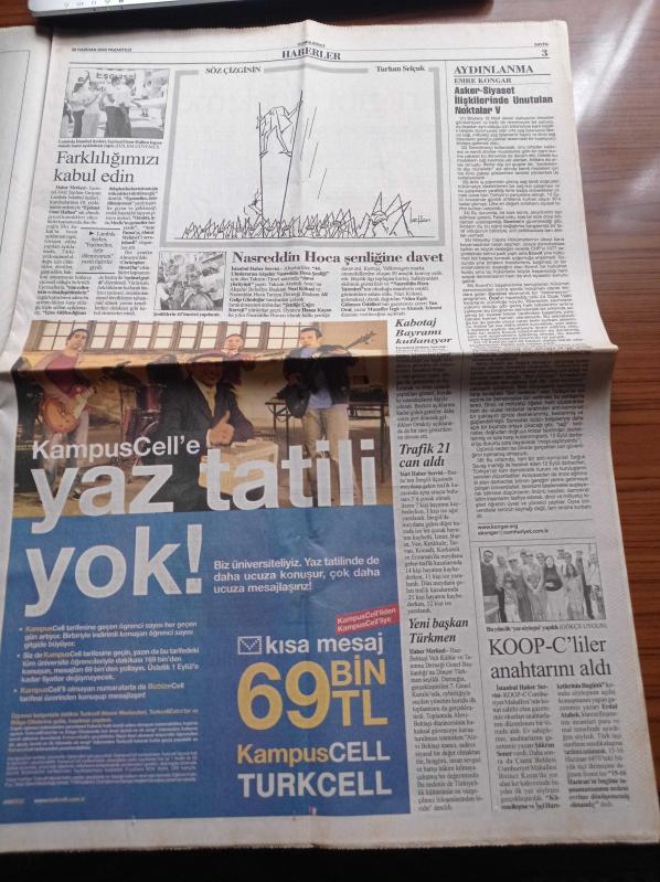 Cumhuriyet Gazetesi - 30 Haziran 2003 - Atletizmde Forma Karmaşası - İsviçre Rallisi'nde Çocuk Öldü - Türk Futbolu Dünya Markası - Rivaldo'ya Şartlı Onay - Abdullah Gül'den Fettullah Gülen'e Övgü - Recep Tayyip Erdoğan Tabanına Oynuyor İmam Hatip Takıyyesi - Hindistan Artık IMF Kreditörü - ABD Irak'ta Türk Askeri İstiyor adlı eser Türkçe dilindedir.