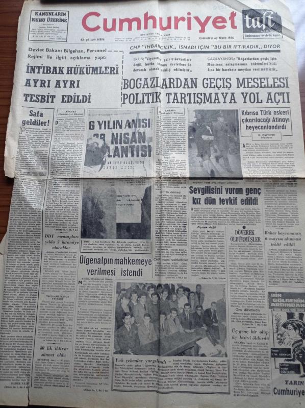 Cumhuriyet Gazetesi - 30 Nisan 1966 - Kurucusu Yunus Nadi - İlhan Selçuk - Su Uyur Komünist Uyumaz - Devlet Bakanı Cihat Bilgehan Personel Rejimi İle İlgili Açıklama Yaptı - Bahar Bayramının 1 Mayıs'tan 6 Mayıs'a Alınması Teklif Edildi - Hıdırellez - Süleyman Demirel'e Yuh Çekenler Yargılandı - Montreaux Anlaşması - Boğazlardan Geçen Meselesi Politik Tartışmaya Yol Açtı - Kıbrıs'a Türk Askeri Çıkarılacağı Atinayı Heyecanlandırdı adlı eser Türkçe dilindedir.