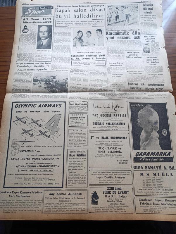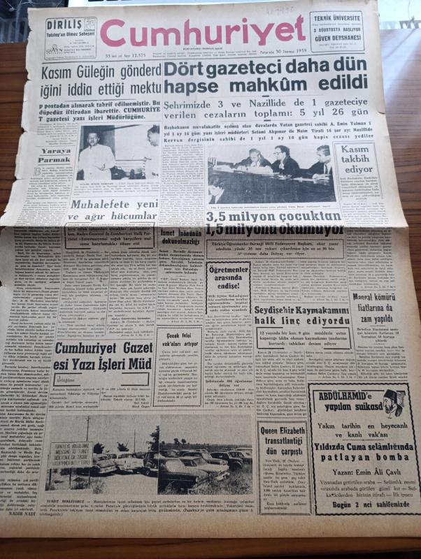 Cumhuriyet Gazetesi - 30 Temmuz 1959 - Ortadirek Yazan Yaşar Kemal Yazı Dizisi - Nadir Nadi Köşe Yazısı - Dört Gazeteci Daha Dün Hapse Mahkum Edildi - Ahmet Emin Yalman - Selami Akpınar - Naim Tiralı - İsmet İnönü'nün Dokunulmazlığı - Çocuk Felci Vakaları Artıyor - Abdülhamid'e Yapılan Suikast Yazan Emin Ali Şavlı Yazı Dizisi - Hollywood'dan Stüdyo Temsilcisi Oscar Lax Geldi - Londra Festivalinde Üniversitelerimiz Başarı Kazandılar - Burhan Felek Köşe Yazısı - Paris'te Kalem Modası - Uluç Ali Yazan Halikarnas Balıkçısı Yazı Dizisi - Ruhi Bahisler Yazan Doktor Halis Özgü - Ankara İstanbul Radyosu Programı - Kitap Gazete Ve Benzerlerinin İthali Serbest - Kızıllar Laos'a Girdiler - Ali Sami Yen'i Hürmetle Anıyoruz - Fenerbahçe Beşiktaş Ve Adalet Sezonu Açıyorlar - Karagümrük Dün Yeni Sezonu Açtı - Fenerbahçe Tarafından Satışa Çıkarılan Kaleci Şükrü Ersoy - Milli Güreşçimiz Hamit Kaplan'a Profesyonellik Teklif Edildi - Balkan Oyunları Gelecek Yıl Türkiye'de Yapılacak - Harem Deniz Kulübü adlı eser, Kitap > Süreli Yayınlar > Gazeteler > Türkiye > Genel > Günlük kategorisinde İkinci El olarak satıştadır.