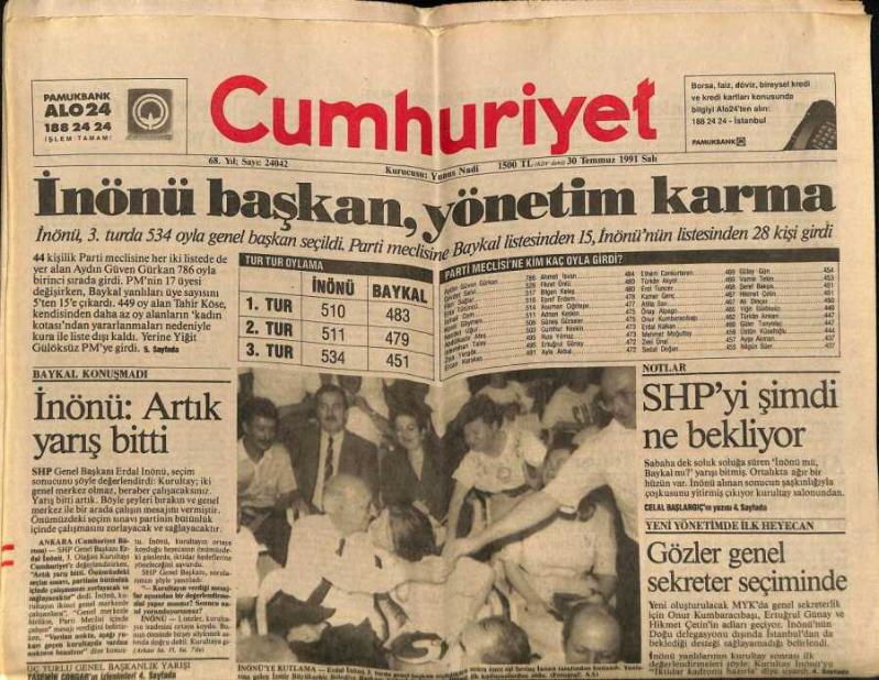 Cumhuriyet Gazetesi 30 Temmuz 1991 - İnönü Başkan , Yönetim Karma GZ65112, en son 20 gün önce güncellenmiştir.