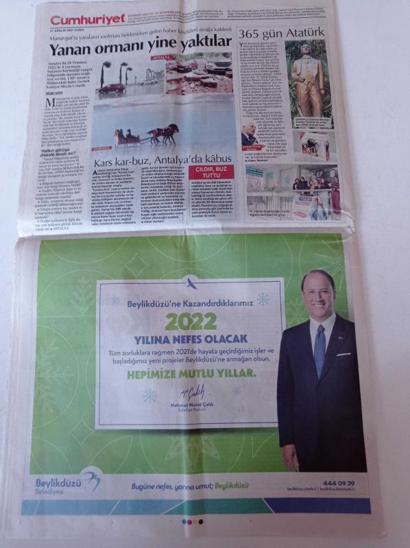 Sayfa Boyutu: 35*56cm Sayfa Sayısı:16 Cumhuriyet Gazetesi Yıpranma, sararmalar, kupon kesiği ve yırtılmalar zamana bağlı olarak görülebilir