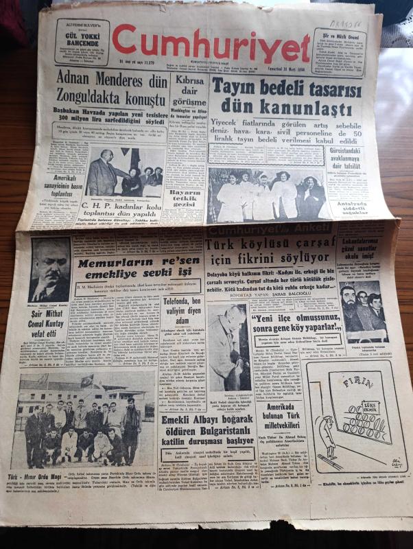 Cumhuriyet Gazetesi - 31 Mart 1956 - Adnan Menderes Dün Zonguldak'ta konuştu - Kıbrıs'a dair görüşme - eski Başbakan Şemsettin Günaltay dünkü toplantıda konuşurken fotoğraf - Şair Mithat Cemal Kuntay vefat etti - Celal Bayar'ın tetkik gezisi - Cumhuriyet anketi Türk köylüsü çarşaf için fikrini söylüyor röportajı yapan Şahab Balcıoğlu - lokantalarımız Güzel Sanatlar okulu imiş - Amerika'da bulunan Türk milletvekilleri Nazlı Tlabar ile Ahmet Tokuş dış politikamızı amerikalılara anlattılar - Çakırcalıyı biz öldürdük anlatan Albay Rüştü Kobaş yazan Yaşar Kemal Yazı Dizisi - Perçemli adam yazanlar Nihal Karamağaralı ve Va Nü yazı dizisi - mücerret fıkralar yazan Burhan Felek - Ankara Istanbul radyosu programı - Monako Prensi ile Grace Kelly nikahlarının kıyıldığı gece 600 kişiyi operaya davet etmiştir fotoğraf - Zeki Müren bebek gazinosunda - Türkiye'de rekortmenlerinden Cahit Önelin Amerika'daki ilk başarısı - Fenerbahçe Vefa karşılaşıyorlar - Fenerbahçe kayak takımı mı kuruyor, Yunus Nadi tarafından kaleme alınmıştır. Cumhuriyet Gazetesi - 31 Mart 1956 - Adnan Menderes Dün Zonguldak'ta konuştu - Kıbrıs'a dair görüşme - eski Başbakan Şemsettin Günaltay dünkü toplantıda konuşurken fotoğraf - Şair Mithat Cemal Kuntay vefat etti - Celal Bayar'ın tetkik gezisi - Cumhuriyet anketi Türk köylüsü çarşaf için fikrini söylüyor röportajı yapan Şahab Balcıoğlu - lokantalarımız Güzel Sanatlar okulu imiş - Amerika'da bulunan Türk milletvekilleri Nazlı Tlabar ile Ahmet Tokuş dış politikamızı amerikalılara anlattılar - Çakırcalıyı biz öldürdük anlatan Albay Rüştü Kobaş yazan Yaşar Kemal Yazı Dizisi - Perçemli adam yazanlar Nihal Karamağaralı ve Va Nü yazı dizisi - mücerret fıkralar yazan Burhan Felek - Ankara Istanbul radyosu programı - Monako Prensi ile Grace Kelly nikahlarının kıyıldığı gece 600 kişiyi operaya davet etmiştir fotoğraf - Zeki Müren bebek gazinosunda - Türkiye'de rekortmenlerinden Cahit Önelin Amerika'daki ilk başarısı - Fenerbahçe Vefa karşılaşıyorlar - Fenerbahçe kayak takımı mı kuruyor adlı eser Türkçe dilindedir.