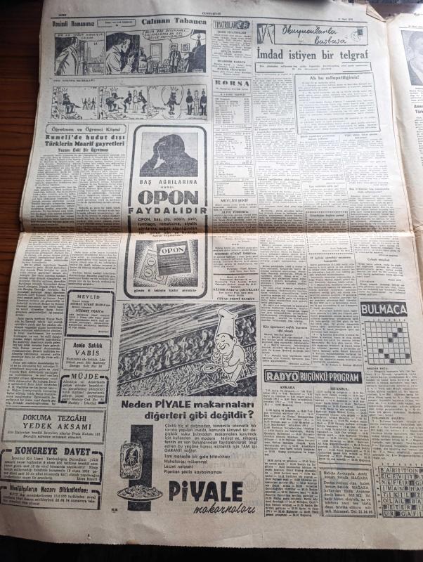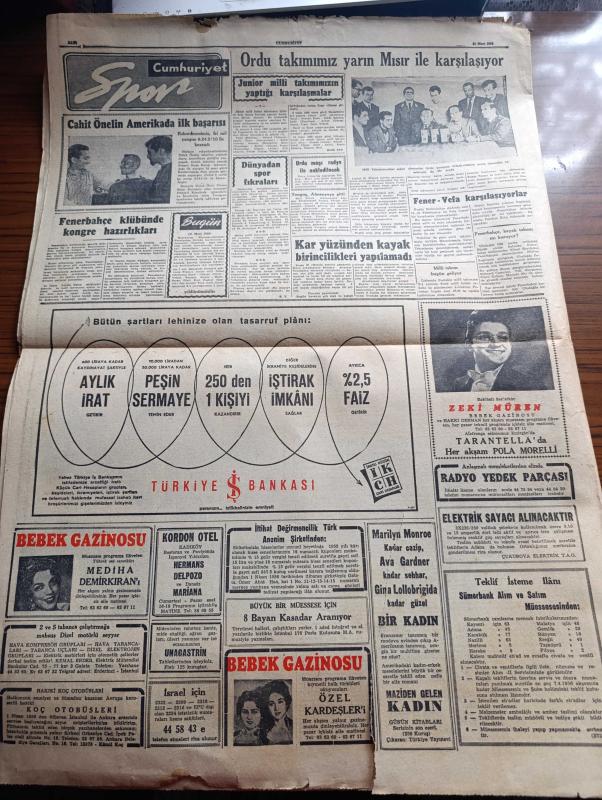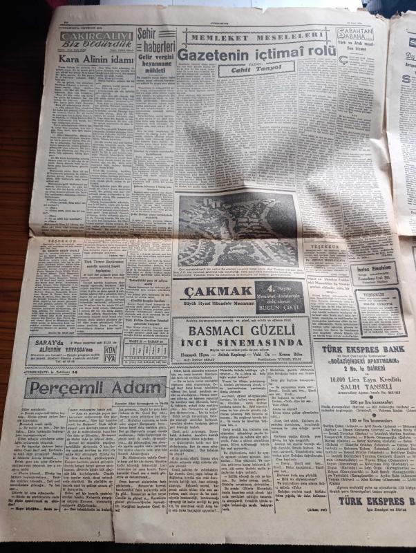 Cumhuriyet Gazetesi - 31 Mart 1956 - Adnan Menderes Dün Zonguldak'ta konuştu - Kıbrıs'a dair görüşme - eski Başbakan Şemsettin Günaltay dünkü toplantıda konuşurken fotoğraf - Şair Mithat Cemal Kuntay vefat etti - Celal Bayar'ın tetkik gezisi - Cumhuriyet anketi Türk köylüsü çarşaf için fikrini söylüyor röportajı yapan Şahab Balcıoğlu - lokantalarımız Güzel Sanatlar okulu imiş - Amerika'da bulunan Türk milletvekilleri Nazlı Tlabar ile Ahmet Tokuş dış politikamızı amerikalılara anlattılar - Çakırcalıyı biz öldürdük anlatan Albay Rüştü Kobaş yazan Yaşar Kemal Yazı Dizisi - Perçemli adam yazanlar Nihal Karamağaralı ve Va Nü yazı dizisi - mücerret fıkralar yazan Burhan Felek - Ankara Istanbul radyosu programı - Monako Prensi ile Grace Kelly nikahlarının kıyıldığı gece 600 kişiyi operaya davet etmiştir fotoğraf - Zeki Müren bebek gazinosunda - Türkiye'de rekortmenlerinden Cahit Önelin Amerika'daki ilk başarısı - Fenerbahçe Vefa karşılaşıyorlar - Fenerbahçe kayak takımı mı kuruyor adlı eser, Kitap > Süreli Yayınlar > Gazeteler > Türkiye > Genel > Günlük kategorisinde İkinci El olarak satıştadır.