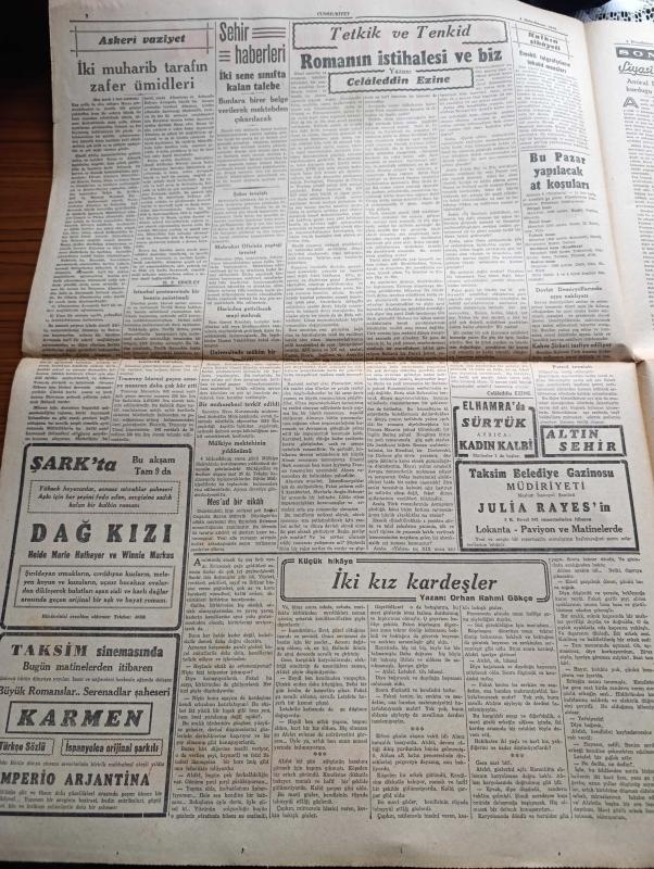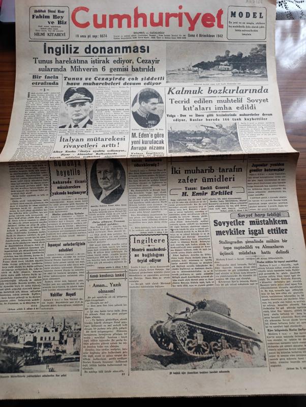Cumhuriyet Gazetesi - 4 Birincikanun ( Aralık) 1942 - Bir Facia Etrafında 3 - İngiliz Donanması Tunus Harekatına İştirak Ediyor Cezayir Sularında Mihverin 6 Gemisi Batırıldı - İngiliz Hariciye Nazırı M. Eden'e Göre Yeni Kurulacak Avrupa Nizamı - Kalmuk Bozkırlarında Tecrid Edilen Muhtelif Sovyet Kıtaları İmha Edildi - Amerikan Bahriye Nazırı Albay Knox Fotoğraf - Japonlar Yeniden Gemiler Batırmışlar - Stalingradın Şimalinde Mühim Bir Tepe Zaptedildi - İki Muharib Tarafın Zafer Ümitleri Yazan Emekli General H. Emir Erkilet - Romanın İstihalesi Ve Biz Yazan Celaleddin Ezine - Küçük Hikaye İki Kız Kardeşler Yazan Orhan Rahmi Gökçe - Bu Pazar Yapılacak At Koşuları - Karmen Taksim Sinemasında - Kar İzleri Örttü Yazan Henri Bordeaux Yazı Dizisi - Amiral Darlan'ın Kurduğu Teşekkül - İtalyan Mütarekesi Rivayetleri Arttı - Kanada Sularında Batırılan Alman Denizaltıları - Yenir Mi Yenmez Mi Yazan Burhan Felek Köşe Yazısı - Merhum Faik Üstünidmanın Cenazesi Defnedildi -Doktor Kemal Saraçoğlu adlı eser, Kitap > Süreli Yayınlar > Gazeteler > Türkiye > Genel > Günlük kategorisinde İkinci El olarak satıştadır.