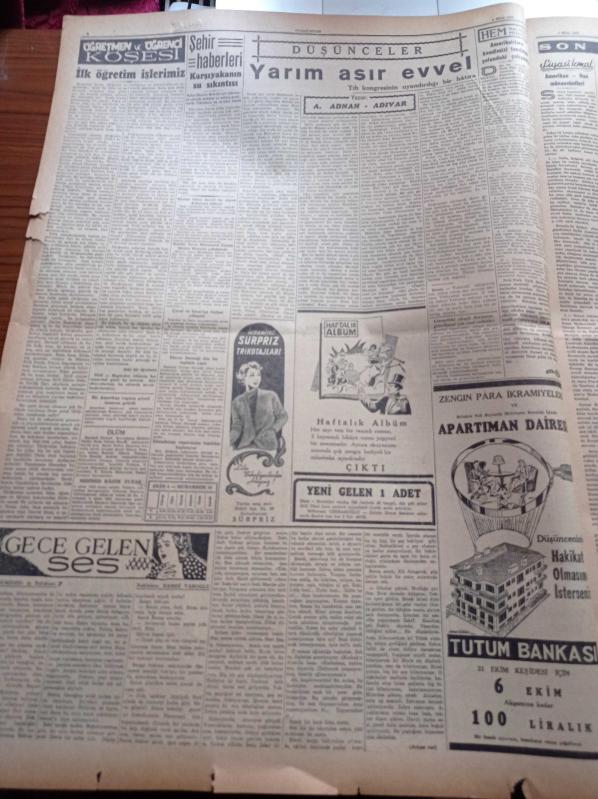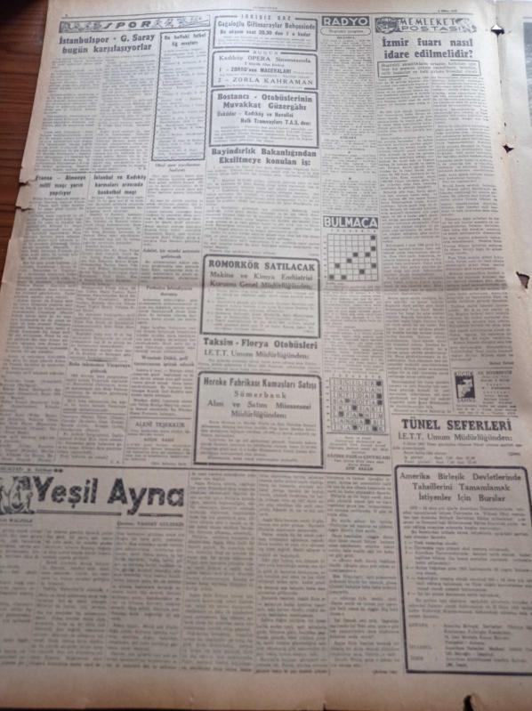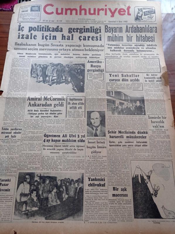 Cumhuriyet Gazetesi - 4 Ekim 1952 - İç Politikada Gerginliği İzale İçin Hal Çaresi - Celal Bayar'ın Ardahanlılara Mühim Bir Hitabesi - Amerika Rusya Gerginliği - İngiltere'nin İlk Atom Silahı İnfilak Etti - Öğretmen Ali Ulvi 3 Yıl 4 Ay Hapse Mahkum Oldu - Yeni Sahaflar Çarşısı Dün Açıldı. A. Adnan Adıvar - Kore'deki Amerikan Hava Kuvveti Artıyor - Charlie Chaplin Komünist Partisi Mensubu Olmakla İtham Ediliyor - Bu Sene Nobel Sulh Mükafatı Verilmeyecek - Gangster Alcapone'un Kardeşi Öldü - İzmir Fuarı Nasıl İdare Edilmelidir - Fransa Almanya Milli Maçı Yarın Yapılıyor - Futbolcu İsfendiyarın Durumu - Hamiyet Yüceses - Ferdi Tayfur - Mürüvvet Sim - Sinyör Rafael Larca- Perihan Altındağ Sözeri - GEM Makinaları - Emlak Bankası - Ziraat Bankası - Revue Saatleri - İlham Gencer - Taksim Kristal Salonu, Yunus Nadi tarafından kaleme alınmıştır. Cumhuriyet Gazetesi - 4 Ekim 1952 - İç Politikada Gerginliği İzale İçin Hal Çaresi - Celal Bayar'ın Ardahanlılara Mühim Bir Hitabesi - Amerika Rusya Gerginliği - İngiltere'nin İlk Atom Silahı İnfilak Etti - Öğretmen Ali Ulvi 3 Yıl 4 Ay Hapse Mahkum Oldu - Yeni Sahaflar Çarşısı Dün Açıldı. A. Adnan Adıvar - Kore'deki Amerikan Hava Kuvveti Artıyor - Charlie Chaplin Komünist Partisi Mensubu Olmakla İtham Ediliyor - Bu Sene Nobel Sulh Mükafatı Verilmeyecek - Gangster Alcapone'un Kardeşi Öldü - İzmir Fuarı Nasıl İdare Edilmelidir - Fransa Almanya Milli Maçı Yarın Yapılıyor - Futbolcu İsfendiyarın Durumu - Hamiyet Yüceses - Ferdi Tayfur - Mürüvvet Sim - Sinyör Rafael Larca- Perihan Altındağ Sözeri - GEM Makinaları - Emlak Bankası - Ziraat Bankası - Revue Saatleri - İlham Gencer - Taksim Kristal Salonu adlı eser Türkçe dilindedir.
