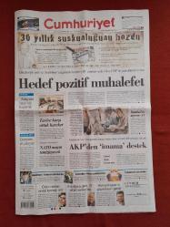 Cumhuriyet Gazetesi 4 Ekim 2010 Hedef Pozitif Muhalefet,AKP'den İmama Destek,Teröre Karşı Ortak Hareket,NATO Mayın Temizleyecek,Erbakan Yeniden Sahaya Çıktı,Kürtçe Kurslara Ayar,Çizgide Kırılma Yok,Trabzon Kafasını Kullandı,Schuster Zehir Zemberek,Sahada Yüksek Gerilim,Sofuoğlu Zirveye Çıktı,Oklar Hiddink'in Üzerinde,Bursa'ya Belediye Freni adlı eser, Kitap > Süreli Yayınlar > Gazeteler > Türkiye > Genel > Günlük kategorisinde İkinci El olarak satıştadır.