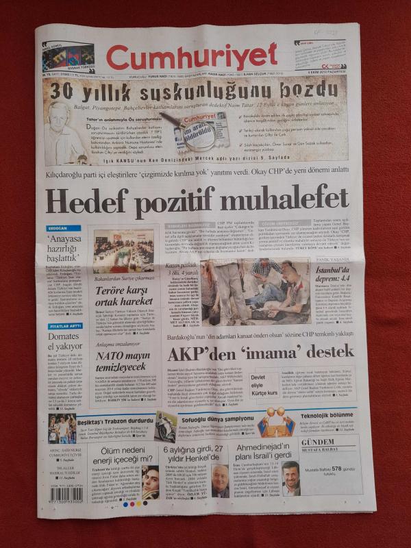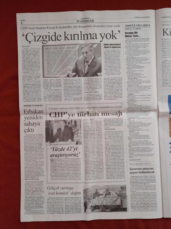 Kitap 2010 yılında yayınlanmıştır. 20 sayfadır. Cumhuriyet Gazetesi 4 Ekim 2010 Hedef Pozitif Muhalefet,AKP'den İmama Destek,Teröre Karşı Ortak Hareket,NATO Mayın Temizleyecek,Erbakan Yeniden Sahaya Çıktı,Kürtçe Kurslara Ayar,Çizgide Kırılma Yok,Trabzon Kafasını Kullandı,Schuster Zehir Zemberek,Sahada Yüksek Gerilim,Sofuoğlu Zirveye Çıktı,Oklar Hiddink'in Üzerinde,Bursa'ya Belediye Freni adlı eser Türkçe dilindedir.