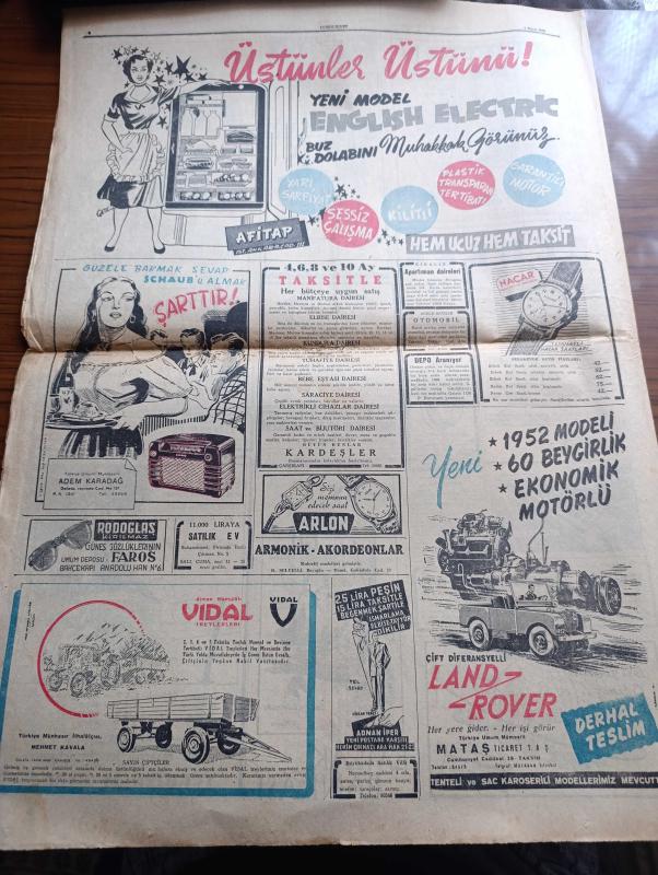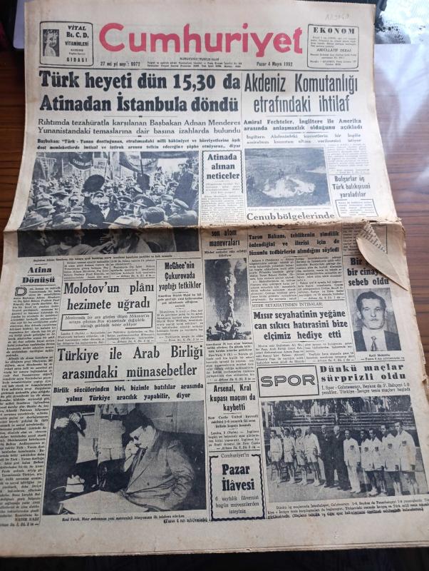 Cumhuriyet Gazetesi - 4 Mayıs 1952 - Atina Dönüşü Yazan Nadir Nadi Başmakale - Türk Heyeti Dün 15.30 Da Atina'dan İstanbul'a Döndü - Başbakan Adnan Menderes Dün Karaya Ayak Bastıktan Sonra Kendisini Karşılayan Partililer Ve Halk Arasında Fotoğraf - Türkiye İle Arap Birliği Arasındaki Münasebetler - İsviçre İle Türk Milli Tenis Takımı Maçı Fotoğraf - Arsenal Kral Kupası Maçını Da Kaybetti - Bir Beyaz Gömleklinin Dramı Yazan Doktor Burhan Öncel Yazı Dizisi - Karaköy Köprüsü Tamir Edilecek - Panaroma Yazan Yakup Kadri Karaosmanoğlu Yazı Dizisi - Mısır Kraliçesi Ve General Franco'nun Kızı Fotoğrafı - Suudi Arabistan'da Milli Banka Kuruluyor - Galatasaray İstanbulspor'a 1 0 Yenildi - Fenerbahçe 0 Beykoz 1 - Haftalık Radyo Programı - Nebati Gıdalar Mı Yoksa Hayvani Gıdalar Mı İnsanı Daha Çok Yaşatır - Dolmabahçe Sarayında Vezir Odası Yazan Haluk Yusuf Şehsuvaroğlu - Emlak Bankası - Senenin En Büyük Konseri Sabite Tur Ve Lütfi Güneri Eskişehir'de - Sirkecide İstanbul Lokantası Açılmıştır adlı eser, Kitap > Süreli Yayınlar > Gazeteler > Türkiye > Genel > Günlük kategorisinde İkinci El olarak satıştadır.