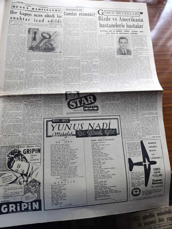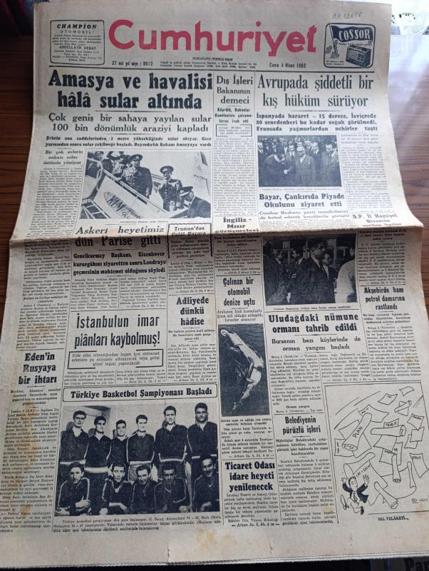 Cumhuriyet Gazetesi - 4 Nisan 1952 - Amasya ve civarı hala sular altında - birçok evlerin enkazı sular üstünde yüzüyor - askeri heyetimiz Dün Paris'e gitti fotoğraf - Avrupa'da şiddetli bir kış hüküm sürüyor - Truman Celal Bayar bir hatıra pulu gönderdi - Türkiye basketbol şampiyonası başladı - Galatasaray basketbol takımı fotoğraf - Akşehir'de ham petrol damarlarına rastlandı - Safiye Ayla kristal saray'da - Bir Beyaz Gömleklinin Dramı yazan Burhan Öncel Yazı Dizisi - ekmekler esmerleşmeye başladı - Panaroma yazan Yakup Kadri Karaosmanoğlu Yazı Dizisi - yanıyor yakılıyor yazan Burhan Felek - Artist Erol Flyn otelciliğe başladı - Hüseyin Cahit Yalçın'ın bir yazısından çıkan dava - Türk güreş karmasına karşı Avrupa muhteliti - olimpiyatlara iştirak edecek milletler - dağların Kızı filmi başrolde Müşerref Taylan Nebile Teker şark sinemasında - 1951-1952 Yunus Nadi mükafatı en güzel şiir - Celal Bayar Çankırı'da piyade okulunu ziyaret etti - İstanbul'un imar planları kaybolmuş -Kore harbi, Yunus Nadi tarafından kaleme alınmıştır. Cumhuriyet Gazetesi - 4 Nisan 1952 - Amasya ve civarı hala sular altında - birçok evlerin enkazı sular üstünde yüzüyor - askeri heyetimiz Dün Paris'e gitti fotoğraf - Avrupa'da şiddetli bir kış hüküm sürüyor - Truman Celal Bayar bir hatıra pulu gönderdi - Türkiye basketbol şampiyonası başladı - Galatasaray basketbol takımı fotoğraf - Akşehir'de ham petrol damarlarına rastlandı - Safiye Ayla kristal saray'da - Bir Beyaz Gömleklinin Dramı yazan Burhan Öncel Yazı Dizisi - ekmekler esmerleşmeye başladı - Panaroma yazan Yakup Kadri Karaosmanoğlu Yazı Dizisi - yanıyor yakılıyor yazan Burhan Felek - Artist Erol Flyn otelciliğe başladı - Hüseyin Cahit Yalçın'ın bir yazısından çıkan dava - Türk güreş karmasına karşı Avrupa muhteliti - olimpiyatlara iştirak edecek milletler - dağların Kızı filmi başrolde Müşerref Taylan Nebile Teker şark sinemasında - 1951-1952 Yunus Nadi mükafatı en güzel şiir - Celal Bayar Çankırı'da piyade okulunu ziyaret etti - İstanbul'un imar planları kaybolmuş -Kore harbi adlı eser Türkçe dilindedir.
