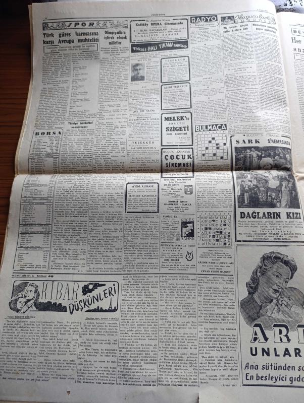 Cumhuriyet Gazetesi - 4 Nisan 1952 - Amasya ve civarı hala sular altında - birçok evlerin enkazı sular üstünde yüzüyor - askeri heyetimiz Dün Paris'e gitti fotoğraf - Avrupa'da şiddetli bir kış hüküm sürüyor - Truman Celal Bayar bir hatıra pulu gönderdi - Türkiye basketbol şampiyonası başladı - Galatasaray basketbol takımı fotoğraf - Akşehir'de ham petrol damarlarına rastlandı - Safiye Ayla kristal saray'da - Bir Beyaz Gömleklinin Dramı yazan Burhan Öncel Yazı Dizisi - ekmekler esmerleşmeye başladı - Panaroma yazan Yakup Kadri Karaosmanoğlu Yazı Dizisi - yanıyor yakılıyor yazan Burhan Felek - Artist Erol Flyn otelciliğe başladı - Hüseyin Cahit Yalçın'ın bir yazısından çıkan dava - Türk güreş karmasına karşı Avrupa muhteliti - olimpiyatlara iştirak edecek milletler - dağların Kızı filmi başrolde Müşerref Taylan Nebile Teker şark sinemasında - 1951-1952 Yunus Nadi mükafatı en güzel şiir - Celal Bayar Çankırı'da piyade okulunu ziyaret etti - İstanbul'un imar planları kaybolmuş -Kore harbi adlı eser, Kitap > Süreli Yayınlar > Gazeteler > Türkiye > Genel > Günlük kategorisinde İkinci El olarak satıştadır.