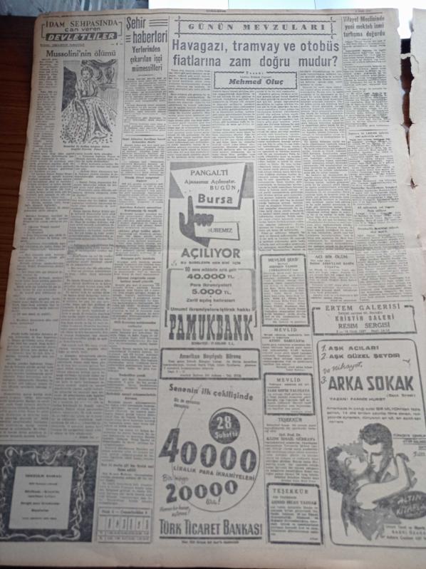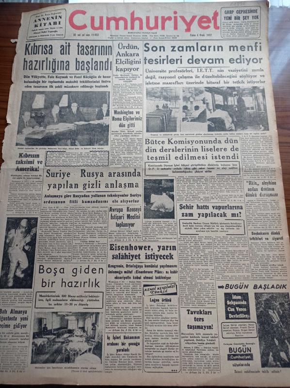 Cumhuriyet Gazetesi - 4 Ocak 1957 - Kıbrıs'a Ait Tasarının Hazırlığına Başlandı - İ.E.T.T'nin Son Yaptığı Zamların Menfi Tesirleri Devam Ediyor - Akis Dergisi Aleyhine Açılan Davanın Dünkü Duruşması - Suriye Rusya Arasında Yapılan Gizli Anlaşma - Macar Mültecileri İçin Boşa Giden Hazırlık - İdam Sehpasında Can Veren Devletliler Yazı Dizisi - Mussolini'nin Ölümü - Mehmed Oluç- Amerikan Kolonisi Mensubları Tiyatrosunun İlk Temsili - Selmi Andak Evlendi - İzmir'de Pasolar Kaldırılınca - Amerika'da Zenci Beyaz Kavgaları - Resimli Romanımız Zırhlı Haydud - Sipahi Şarabı - Nuri İyem - Sabahaddin Kudret Aksal - Yunus Nadi Mükâfatı Şiir Müsabakası - Bulmaca - Fenerbahçe'nin 50. Yıl Kutlama Merasimi 8 Haziran'da Başlıyor - Kombine Biletler Kalkıyor Mu - Galatasaray'ın 50. Yıl Kutlama Merasimi Yarın Kapanıyor - Galatasaray'ın Santrhafı Ergun Ercins Romaya Gitti adlı eser, Kitap > Süreli Yayınlar > Gazeteler > Türkiye > Genel > Günlük kategorisinde İkinci El olarak satıştadır.