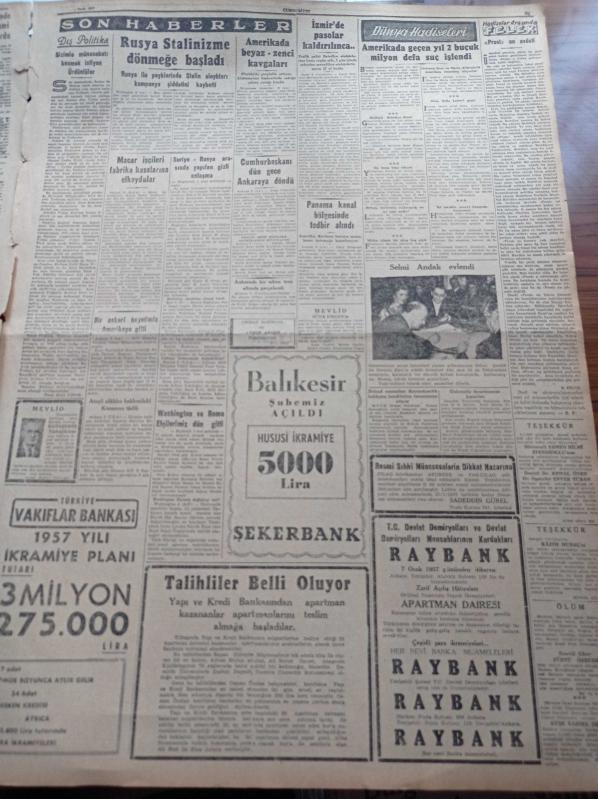 Cumhuriyet Gazetesi - 4 Ocak 1957 - Kıbrıs'a Ait Tasarının Hazırlığına Başlandı - İ.E.T.T'nin Son Yaptığı Zamların Menfi Tesirleri Devam Ediyor - Akis Dergisi Aleyhine Açılan Davanın Dünkü Duruşması - Suriye Rusya Arasında Yapılan Gizli Anlaşma - Macar Mültecileri İçin Boşa Giden Hazırlık - İdam Sehpasında Can Veren Devletliler Yazı Dizisi - Mussolini'nin Ölümü - Mehmed Oluç- Amerikan Kolonisi Mensubları Tiyatrosunun İlk Temsili - Selmi Andak Evlendi - İzmir'de Pasolar Kaldırılınca - Amerika'da Zenci Beyaz Kavgaları - Resimli Romanımız Zırhlı Haydud - Sipahi Şarabı - Nuri İyem - Sabahaddin Kudret Aksal - Yunus Nadi Mükâfatı Şiir Müsabakası - Bulmaca - Fenerbahçe'nin 50. Yıl Kutlama Merasimi 8 Haziran'da Başlıyor - Kombine Biletler Kalkıyor Mu - Galatasaray'ın 50. Yıl Kutlama Merasimi Yarın Kapanıyor - Galatasaray'ın Santrhafı Ergun Ercins Romaya Gitti, Yunus Nadi tarafından kaleme alınmıştır. Cumhuriyet Gazetesi - 4 Ocak 1957 - Kıbrıs'a Ait Tasarının Hazırlığına Başlandı - İ.E.T.T'nin Son Yaptığı Zamların Menfi Tesirleri Devam Ediyor - Akis Dergisi Aleyhine Açılan Davanın Dünkü Duruşması - Suriye Rusya Arasında Yapılan Gizli Anlaşma - Macar Mültecileri İçin Boşa Giden Hazırlık - İdam Sehpasında Can Veren Devletliler Yazı Dizisi - Mussolini'nin Ölümü - Mehmed Oluç- Amerikan Kolonisi Mensubları Tiyatrosunun İlk Temsili - Selmi Andak Evlendi - İzmir'de Pasolar Kaldırılınca - Amerika'da Zenci Beyaz Kavgaları - Resimli Romanımız Zırhlı Haydud - Sipahi Şarabı - Nuri İyem - Sabahaddin Kudret Aksal - Yunus Nadi Mükâfatı Şiir Müsabakası - Bulmaca - Fenerbahçe'nin 50. Yıl Kutlama Merasimi 8 Haziran'da Başlıyor - Kombine Biletler Kalkıyor Mu - Galatasaray'ın 50. Yıl Kutlama Merasimi Yarın Kapanıyor - Galatasaray'ın Santrhafı Ergun Ercins Romaya Gitti adlı eser Türkçe dilindedir.