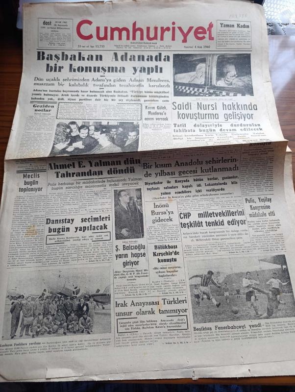 Cumhuriyet Gazetesi - 4 Ocak 1960 - Başbakan Adnan Menderes Adana'da Bir Konuşma Yaptı - Saidi Nursi Hakkında Kovuşturma Gelişiyor - Saidi Nursi'nin Ankara'da Çekilen Son Resmi - Ahmet Emin Yalman Dün Tahran'dan Döndü - Kim Dergisinin Mesul Müdürü Şahap Balcıoğlu Yarın Hapse Giriyor - Bir Kısım Anadolu Şehirlerinde Yılbaşı Kutlanmadı - Polis Yeşilay Kongresine Müdahale Etti - Kızılay'ın Faslılara Yardımı Fotoğraf - Beşiktaş Fenerbahçe'yi Yendi Fotoğraf - Irak Anayasası Türkleri Unsur Olarak Tanımıyor - Küçük Peyk'in Büyük Gazası Yazan A. Cemalettin Saraçoğlu Yazı Dizisi - Türkiye İş Bankası - Amerika'da Kennedy Adaylığını Koydu - Senenin İlk Haftası Yazan Burhan Felek Köşe Yazısı - Kanlı İhtiras Filmi Atlas Sinemasında - Sezai Ömer Madra Zeytinyağı Ve Sabunları - Falcıların Sesleri 1960 Yılına Mars Yıldızı Hükmedecek - Bay Oscar Karikatür - Beşiktaş Fenerbahçe Maçı Hakemi Bulgar Takov Dedi Ki Halk Sahaya Hücum Etti Maçı Eksik Oynattım - Federasyon Asbaşkanı Hakkı Yeten, Yunus Nadi tarafından kaleme alınmıştır. Cumhuriyet Gazetesi - 4 Ocak 1960 - Başbakan Adnan Menderes Adana'da Bir Konuşma Yaptı - Saidi Nursi Hakkında Kovuşturma Gelişiyor - Saidi Nursi'nin Ankara'da Çekilen Son Resmi - Ahmet Emin Yalman Dün Tahran'dan Döndü - Kim Dergisinin Mesul Müdürü Şahap Balcıoğlu Yarın Hapse Giriyor - Bir Kısım Anadolu Şehirlerinde Yılbaşı Kutlanmadı - Polis Yeşilay Kongresine Müdahale Etti - Kızılay'ın Faslılara Yardımı Fotoğraf - Beşiktaş Fenerbahçe'yi Yendi Fotoğraf - Irak Anayasası Türkleri Unsur Olarak Tanımıyor - Küçük Peyk'in Büyük Gazası Yazan A. Cemalettin Saraçoğlu Yazı Dizisi - Türkiye İş Bankası - Amerika'da Kennedy Adaylığını Koydu - Senenin İlk Haftası Yazan Burhan Felek Köşe Yazısı - Kanlı İhtiras Filmi Atlas Sinemasında - Sezai Ömer Madra Zeytinyağı Ve Sabunları - Falcıların Sesleri 1960 Yılına Mars Yıldızı Hükmedecek - Bay Oscar Karikatür - Beşiktaş Fenerbahçe Maçı Hakemi Bulgar Takov Dedi Ki Halk Sahaya Hücum Etti Maçı Eksik Oynattım - Federasyon Asbaşkanı Hakkı Yeten adlı eser Türkçe dilindedir.