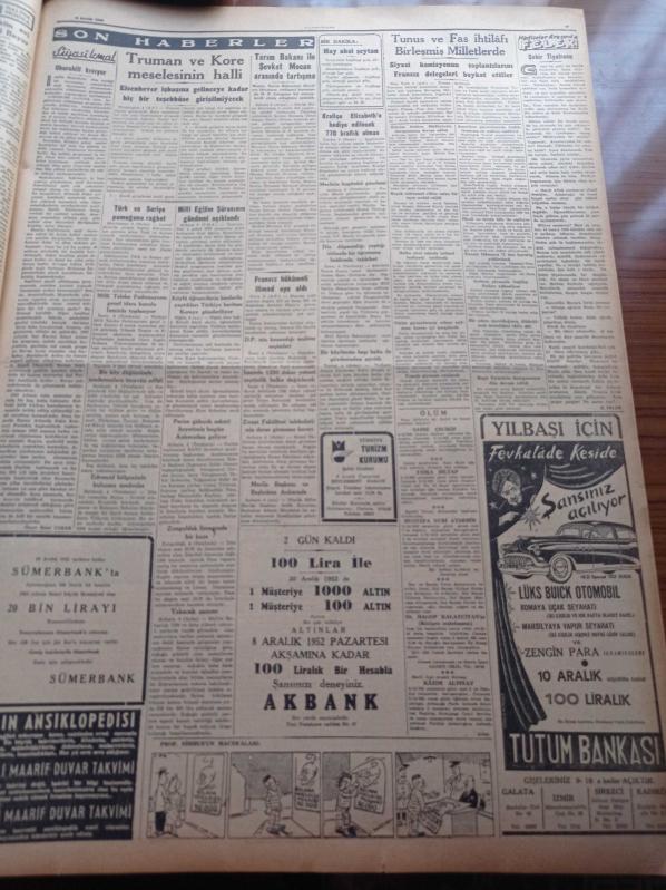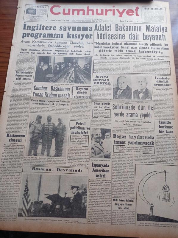 Cumhuriyet Gazetesi - 5 Aralık 1952 - İngiltere Savunma Programını Kısıyor - Adalet Bakanı Osman Şevki Çiçekdağ'ın Malatya Hadisesine Dair Beyanatı - İrtica Meydan Okuyor - Cihad Gazetesi Sahibi Tevfik Kurt - Boğaz Kıyılarında İnşaat Yapılmayacak - Cumhurbaşkanı Celal Bayar Topkapı Müzesini Gezerken - Kastamonu Cinayeti - Eski Muharibler Federasyonunun Yıllık Kongresi - Malatya Hadisesi Sebebiyle Aramalar - Cevad Rifat Atılhan - Hakkı Sadık Acarlı - Milli Takım Kalecisi Turgay Şeren'in Lisansı İptal Edildi- Büyük Doğucular - Süper Mürşid Necip Fazıl Kısakürek'e Ait Bir İhbar- Kraliçe Elizabeth'e Hediye Edilecek 770 Karatlık Elmas - Galatasaraylı Reha Nişanlandı - Ses Sanatkarı Saime Sinan- Krem Pertev - Gripin - Arı Bisküvileri - Komünizm İslamiyetin Düşmanıdır - Borsa - PYE Radyo - Imperial Radyo - Radyolin Diş Macunu, Yunus Nadi tarafından kaleme alınmıştır. Cumhuriyet Gazetesi - 5 Aralık 1952 - İngiltere Savunma Programını Kısıyor - Adalet Bakanı Osman Şevki Çiçekdağ'ın Malatya Hadisesine Dair Beyanatı - İrtica Meydan Okuyor - Cihad Gazetesi Sahibi Tevfik Kurt - Boğaz Kıyılarında İnşaat Yapılmayacak - Cumhurbaşkanı Celal Bayar Topkapı Müzesini Gezerken - Kastamonu Cinayeti - Eski Muharibler Federasyonunun Yıllık Kongresi - Malatya Hadisesi Sebebiyle Aramalar - Cevad Rifat Atılhan - Hakkı Sadık Acarlı - Milli Takım Kalecisi Turgay Şeren'in Lisansı İptal Edildi- Büyük Doğucular - Süper Mürşid Necip Fazıl Kısakürek'e Ait Bir İhbar- Kraliçe Elizabeth'e Hediye Edilecek 770 Karatlık Elmas - Galatasaraylı Reha Nişanlandı - Ses Sanatkarı Saime Sinan- Krem Pertev - Gripin - Arı Bisküvileri - Komünizm İslamiyetin Düşmanıdır - Borsa - PYE Radyo - Imperial Radyo - Radyolin Diş Macunu adlı eser Türkçe dilindedir.