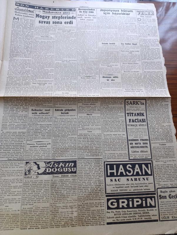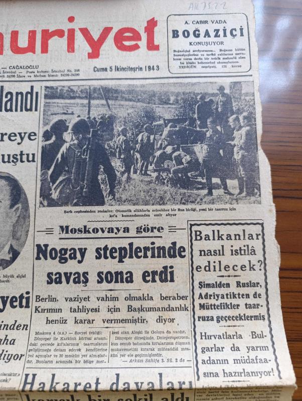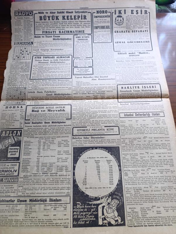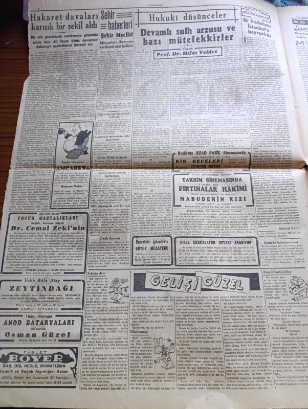 Cumhuriyet Gazetesi - 5 İkinciteşrin (Kasım) 1943 - Fransasız Avrupa Yazan Nadir Nadi Köşe Yazısı - İngiliz Hariciye Nazırı Mister Eden Kahireye Vardı - Kahire'de Görüşmelere Başlandı - Moskova'ya Göre Nogay Steplerinde Savaş Sona Erdi - Şark Cephesinden Resimler - Balkanlar Nasıl İstila Edilecek - Hakaret Davaları Karışık Bir Şekil Aldı - Bir Çok Gazetelerin Mahkemeye Gitmesine Sebep Olan Ali İhsan Sabis Davasının Ankara'ya Nakledilmesi İhtimali Var - Binden Fazla Amerikan Tayyaresi Gündüz Almanya'ya Hücum Ederek Büyük Hasarlar Yaptı - Hukuk Fakültesi Dekanı Sıddık Sami Onar - 2 Büyük Film Fırtınalar Hakimi Ve Mabudenin Kızı Taksim Sinemasında - Devamlı Sulh Arzusu Ve Bazı Mütefekkirler Yazan Profesör Doktor Hıfzı Veldet Köşe Yazısı - Aşkın Doğuşu Yazan Peride Celal Yazı Dizisi - Hak Hukuk Yazan Burhan Felek Köşe Yazısı - Bugünkü Radyo Programı - Arlon Saatleri - Uyuz Ve Deri Kaşıntılarını Dermoliv Çabuk Geçirir - Bugünkü Radyo Programı adlı eser, Kitap > Süreli Yayınlar > Gazeteler > Türkiye > Genel > Günlük kategorisinde İkinci El olarak satıştadır.