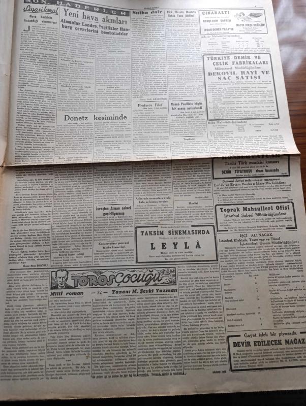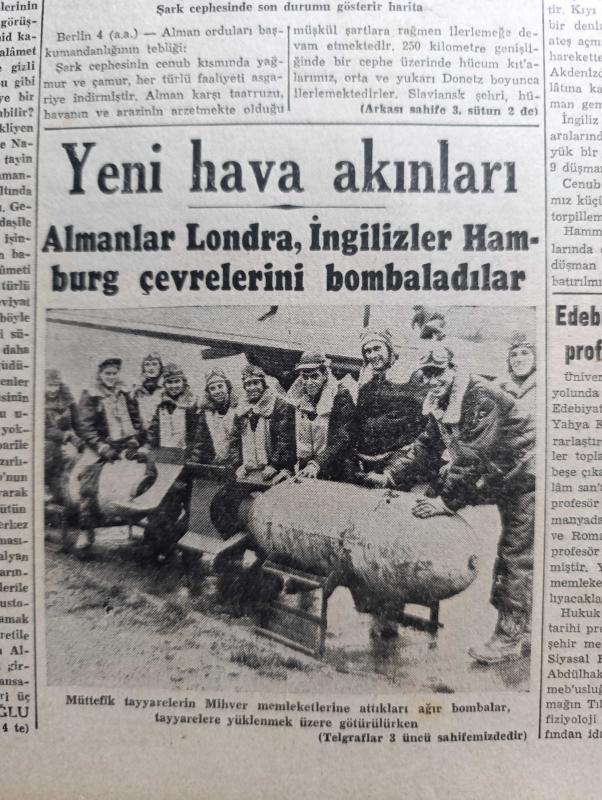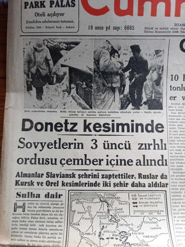 Cumhuriyet Gazetesi - 5 Mart 1943 - Sulha dair yazan Yunus Nadi Abalıoğlu Başmakale - Donetz kesiminde sovyetlerin 3. Zırhlı ordusu çember içine alındı - Alman kıtaları mühimmatının muhafaza olduğu yerler fotoğraf - piyade erlerine el bombası dağıtılıyor fotoğraf - Şark cephesinde son durumu gösterir harita - Cenup Pasifik'te Büyük bir savaş neticelendi - bir Japon gemi kafilesine hava taarruzu esnasında fotoğraf - Bulgar başvekili profesör Filof Türkiye'nin kati bitaraflığına emin - bir İngiliz denizaltısı Cenova'da deniz tezgahlarını top ateşine tuttu - Londra sığınaklarında bir facia - Türk filozofu Mustafa Şekip Tunç jübilesi fotoğraf - Almanlar Londra İngilizler Hamburg çevrelerini bombaladılar - müttefik tayyarelerin Mihver memleketlerine attıkları ağır bombalar fotoğraf - Doktor pinpon filmi elhamra sinemasında - Kamil Tekin esrarlı hayal oyunları ses tiyatrosunda - bizim edebiyatımız yazan Nurullah Ataç - Toros çocuğu yazan M. Şevket Yazman Yazı Dizisi - unutulan Varlık vergisi adlı eser, Kitap > Süreli Yayınlar > Gazeteler > Türkiye > Genel > Günlük kategorisinde İkinci El olarak satıştadır.