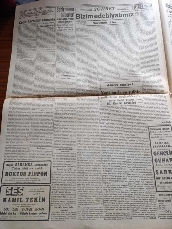 Cumhuriyet Gazetesi - 5 Mart 1943 - Sulha dair yazan Yunus Nadi Abalıoğlu Başmakale - Donetz kesiminde sovyetlerin 3. Zırhlı ordusu çember içine alındı - Alman kıtaları mühimmatının muhafaza olduğu yerler fotoğraf - piyade erlerine el bombası dağıtılıyor fotoğraf - Şark cephesinde son durumu gösterir harita - Cenup Pasifik'te Büyük bir savaş neticelendi - bir Japon gemi kafilesine hava taarruzu esnasında fotoğraf - Bulgar başvekili profesör Filof Türkiye'nin kati bitaraflığına emin - bir İngiliz denizaltısı Cenova'da deniz tezgahlarını top ateşine tuttu - Londra sığınaklarında bir facia - Türk filozofu Mustafa Şekip Tunç jübilesi fotoğraf - Almanlar Londra İngilizler Hamburg çevrelerini bombaladılar - müttefik tayyarelerin Mihver memleketlerine attıkları ağır bombalar fotoğraf - Doktor pinpon filmi elhamra sinemasında - Kamil Tekin esrarlı hayal oyunları ses tiyatrosunda - bizim edebiyatımız yazan Nurullah Ataç - Toros çocuğu yazan M. Şevket Yazman Yazı Dizisi - unutulan Varlık vergisi, Yunus Nadi tarafından kaleme alınmıştır. Cumhuriyet Gazetesi - 5 Mart 1943 - Sulha dair yazan Yunus Nadi Abalıoğlu Başmakale - Donetz kesiminde sovyetlerin 3. Zırhlı ordusu çember içine alındı - Alman kıtaları mühimmatının muhafaza olduğu yerler fotoğraf - piyade erlerine el bombası dağıtılıyor fotoğraf - Şark cephesinde son durumu gösterir harita - Cenup Pasifik'te Büyük bir savaş neticelendi - bir Japon gemi kafilesine hava taarruzu esnasında fotoğraf - Bulgar başvekili profesör Filof Türkiye'nin kati bitaraflığına emin - bir İngiliz denizaltısı Cenova'da deniz tezgahlarını top ateşine tuttu - Londra sığınaklarında bir facia - Türk filozofu Mustafa Şekip Tunç jübilesi fotoğraf - Almanlar Londra İngilizler Hamburg çevrelerini bombaladılar - müttefik tayyarelerin Mihver memleketlerine attıkları ağır bombalar fotoğraf - Doktor pinpon filmi elhamra sinemasında - Kamil Tekin esrarlı hayal oyunları ses tiyatrosunda - bizim edebiyatımız yazan Nurullah Ataç - Toros çocuğu yazan M. Şevket Yazman Yazı Dizisi - unutulan Varlık vergisi adlı eser Türkçe dilindedir.