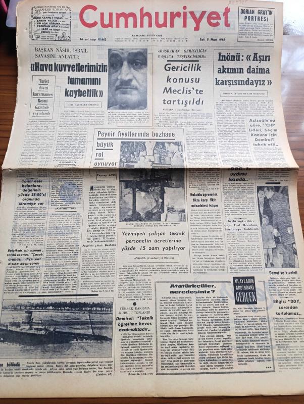 Cumhuriyet Gazetesi - 5 Mart 1968 - Başkan Nasır İsrail Savaşını Anlattı - Tarihi Eser Bulanlara Değerinin Yüzde 25 50 si Oranında İkramiye Var - İsmet İnönü Aşırı Akımın Daima Karşısındayız - Başbakan Süleyman Demirel Gericiliğin Başlıca Teşvikçisidir - Ulaştırma Bakanı Sadettin Bilgiç Devlet Demiryolları Yolları Zarardan Kurtulamaz - İlhan Selçuk Köşe Yazısı - Komünist Partiler Görüşlerini Budapeşte Açıklıyor - İkinci Adam 1950 ve Sonrası Yazan Şevket Süreyya Aydemir Yazı Dizisi - Dişi Bond Çizgi Roman - Garth Çizgi Roman - Tiffany Jones Çizgi Roman - Soul Müziği - Fenerbahçe'nin Teknik Direktörü Molnar Memnun Şampiyonluğa Daha Çok Yaklaştık - Sten Suvio Boks Milli Takımımızı Çalıştıracak - Yılmaz Şen Ben Metin Oktay'a Taparım - Türkiye Basketbol Kupası İstanbul Grubu Yarı Finali - Spor Toto Tahminleri, Yunus Nadi tarafından kaleme alınmıştır. Cumhuriyet Gazetesi - 5 Mart 1968 - Başkan Nasır İsrail Savaşını Anlattı - Tarihi Eser Bulanlara Değerinin Yüzde 25 50 si Oranında İkramiye Var - İsmet İnönü Aşırı Akımın Daima Karşısındayız - Başbakan Süleyman Demirel Gericiliğin Başlıca Teşvikçisidir - Ulaştırma Bakanı Sadettin Bilgiç Devlet Demiryolları Yolları Zarardan Kurtulamaz - İlhan Selçuk Köşe Yazısı - Komünist Partiler Görüşlerini Budapeşte Açıklıyor - İkinci Adam 1950 ve Sonrası Yazan Şevket Süreyya Aydemir Yazı Dizisi - Dişi Bond Çizgi Roman - Garth Çizgi Roman - Tiffany Jones Çizgi Roman - Soul Müziği - Fenerbahçe'nin Teknik Direktörü Molnar Memnun Şampiyonluğa Daha Çok Yaklaştık - Sten Suvio Boks Milli Takımımızı Çalıştıracak - Yılmaz Şen Ben Metin Oktay'a Taparım - Türkiye Basketbol Kupası İstanbul Grubu Yarı Finali - Spor Toto Tahminleri adlı eser Türkçe dilindedir.