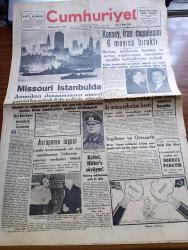 Cumhuriyet Gazetesi - 5 Nisan 1946 - Dost Amerika'nın Denizcilerini Karşılarken Yazan Nadir Nadi Köşe Yazısı - Missouri İstanbul'da - Misouri Hareketinden Evvel New York Limanında Fotoğraf - Güvenlik Konseyi İran Meselesini 6 Mayısa Bıraktı - İngiltere Arnavutluk İle Münasebatını Kesti - Harp Devamınca Alman Genelkurmay Başkanlığı Yapan Mareşal Keitel Hitler'e Sövüyor - Mehmed Münirin Fikir Tarihimizdeki Mevkii Yazan Profesör Ziyaeddin Fahri Fındıkoğlu - İzmir At Yarışlarının Üçüncü Haftasına Aid Program - Gazi Osman Paşa Mezarında Dün Tören Yapıldı - İzmir Kayagücü Takımı Geldi - Miskinler Tekkesi Yazan Reşat Nuri Güntekin Yazı Dizisi - Stalin Amerika Büyükelçisinin Kabul Etti - Meşrutiyet Tiyatrosu Baykuş - Amcabey Missouri'de Çizen Cemal Nadir Karikatür Çizen Cemal Nadir Karikatür - EIA Radyo - Aga Plak Değiştirici Makinesi - Bugünkü Radyo Programı - Muammer Karaca Tiyatrosu Platin Palas Beyoğlu Lale Sinemasında - Zeki Çan Çil İlacı - Tokalon Pudra adlı eser, Kitap > Süreli Yayınlar > Gazeteler > Türkiye > Genel > Günlük kategorisinde İkinci El olarak satıştadır.