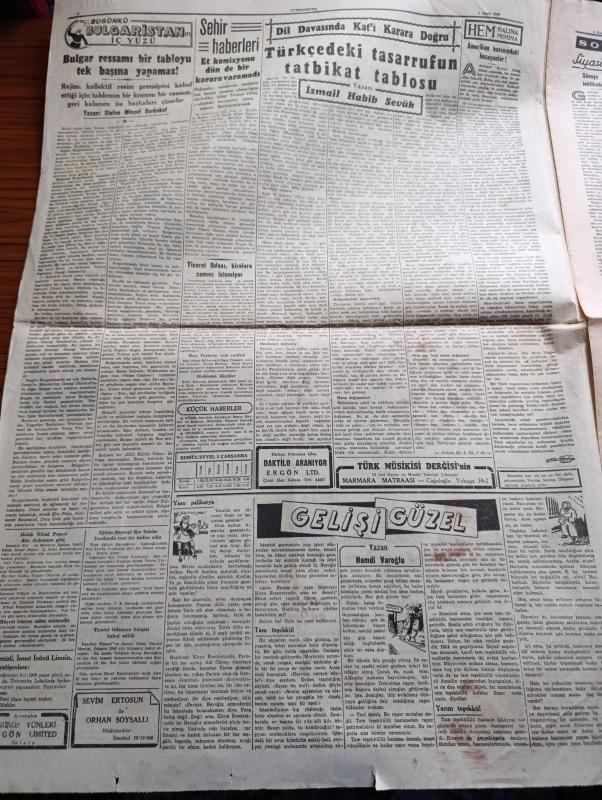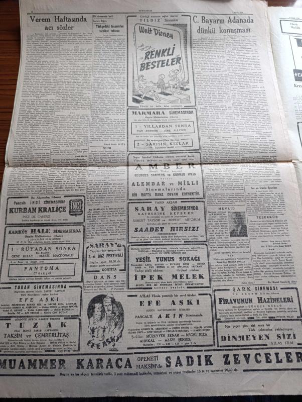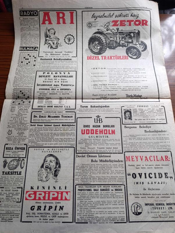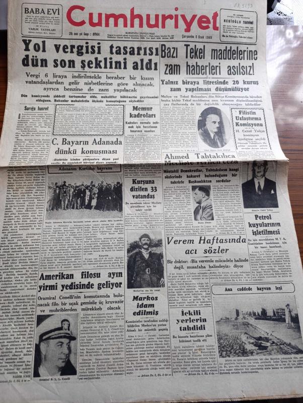 Cumhuriyet Gazetesi - 5 Ocak 1949 - Sarığa Hasret Yazan Nadir Nadi Başmakale - Yol Vergisi Tasarısı Dün Son Şeklini Aldı - Bazı Tekel Maddelerinde Zam Asılsız - Celal Bayar'ın Adana'nın Kurtuluş Bayramı'nda Konuşması - Yunanistan'da Markos Komünistler Tarafından İdam Edilmiş - Kurşuna Dizilen 33 Vatandaş - Filistin Uzlaştırma Komisyonu Hüseyin Cahit Yalçın Komisyon Üyeliğine Seçildi - Ahmet Tahtakılıça Mecliste Verilen Ceza - Bugünkü Bulgaristan'ın İç Yüzü Yazan Stefan Minçef Sarbakof Yazı Dizisi - Süveyş Kanalı Tehlikede Mi Yazan Ömer Rıza Doğrul - Türkiye'de Çocuk Suçları - Dışarıdaki Türkler Yazan Burhan Felek Köşe Yazısı - Efe Aşkı Pangaltı Akın Sinemasında - Walt Disney Renkli Besteler Yıldız Sinemasında - Kurban Kraliçe Filmi İnci Sinemasında - Milli Piyangocu Tekkollu Cemal - Müzeyyen Senar Işıl Turkuaz Aile Salonunda - Bugünkü Radyo Programı - İstanbul Belediyesi Şehir Tiyatroları Dram Kısmında Ruyblas Komedi Kısmında Paydos Oyunu - Zetor Dizel Traktörleri, Yunus Nadi tarafından kaleme alınmıştır. Cumhuriyet Gazetesi - 5 Ocak 1949 - Sarığa Hasret Yazan Nadir Nadi Başmakale - Yol Vergisi Tasarısı Dün Son Şeklini Aldı - Bazı Tekel Maddelerinde Zam Asılsız - Celal Bayar'ın Adana'nın Kurtuluş Bayramı'nda Konuşması - Yunanistan'da Markos Komünistler Tarafından İdam Edilmiş - Kurşuna Dizilen 33 Vatandaş - Filistin Uzlaştırma Komisyonu Hüseyin Cahit Yalçın Komisyon Üyeliğine Seçildi - Ahmet Tahtakılıça Mecliste Verilen Ceza - Bugünkü Bulgaristan'ın İç Yüzü Yazan Stefan Minçef Sarbakof Yazı Dizisi - Süveyş Kanalı Tehlikede Mi Yazan Ömer Rıza Doğrul - Türkiye'de Çocuk Suçları - Dışarıdaki Türkler Yazan Burhan Felek Köşe Yazısı - Efe Aşkı Pangaltı Akın Sinemasında - Walt Disney Renkli Besteler Yıldız Sinemasında - Kurban Kraliçe Filmi İnci Sinemasında - Milli Piyangocu Tekkollu Cemal - Müzeyyen Senar Işıl Turkuaz Aile Salonunda - Bugünkü Radyo Programı - İstanbul Belediyesi Şehir Tiyatroları Dram Kısmında Ruyblas Komedi Kısmında Paydos Oyunu - Zetor Dizel Traktörleri adlı eser Türkçe dilindedir.