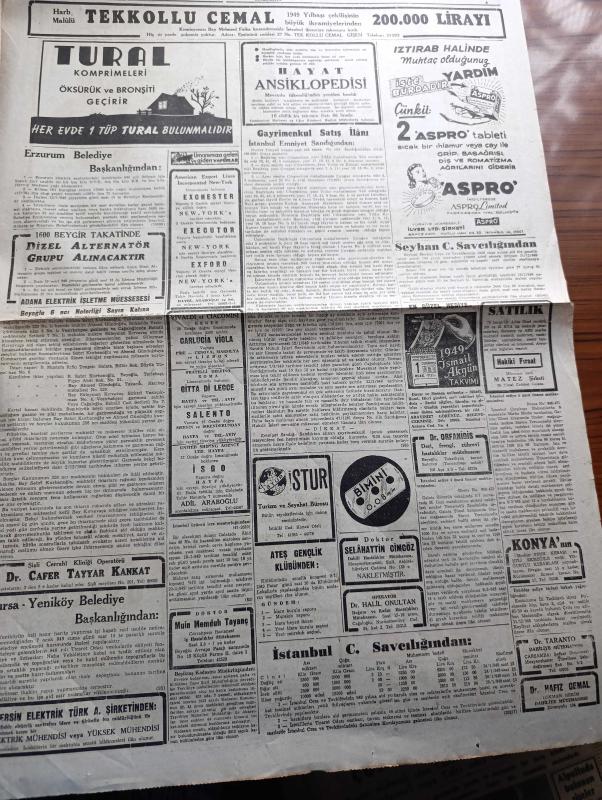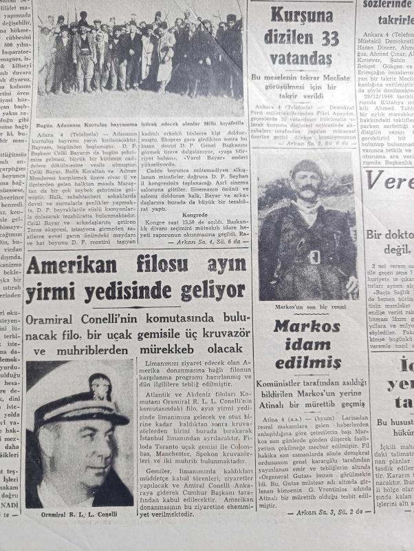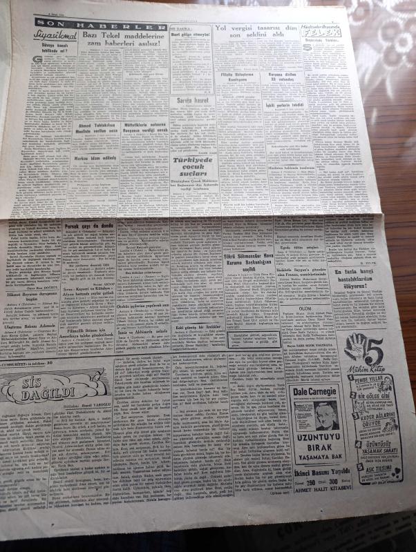 Cumhuriyet Gazetesi - 5 Ocak 1949 - Sarığa Hasret Yazan Nadir Nadi Başmakale - Yol Vergisi Tasarısı Dün Son Şeklini Aldı - Bazı Tekel Maddelerinde Zam Asılsız - Celal Bayar'ın Adana'nın Kurtuluş Bayramı'nda Konuşması - Yunanistan'da Markos Komünistler Tarafından İdam Edilmiş - Kurşuna Dizilen 33 Vatandaş - Filistin Uzlaştırma Komisyonu Hüseyin Cahit Yalçın Komisyon Üyeliğine Seçildi - Ahmet Tahtakılıça Mecliste Verilen Ceza - Bugünkü Bulgaristan'ın İç Yüzü Yazan Stefan Minçef Sarbakof Yazı Dizisi - Süveyş Kanalı Tehlikede Mi Yazan Ömer Rıza Doğrul - Türkiye'de Çocuk Suçları - Dışarıdaki Türkler Yazan Burhan Felek Köşe Yazısı - Efe Aşkı Pangaltı Akın Sinemasında - Walt Disney Renkli Besteler Yıldız Sinemasında - Kurban Kraliçe Filmi İnci Sinemasında - Milli Piyangocu Tekkollu Cemal - Müzeyyen Senar Işıl Turkuaz Aile Salonunda - Bugünkü Radyo Programı - İstanbul Belediyesi Şehir Tiyatroları Dram Kısmında Ruyblas Komedi Kısmında Paydos Oyunu - Zetor Dizel Traktörleri adlı eser, Kitap > Süreli Yayınlar > Gazeteler > Türkiye > Genel > Günlük kategorisinde İkinci El olarak satıştadır.