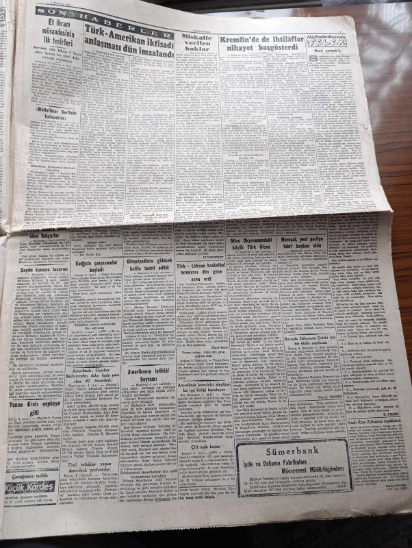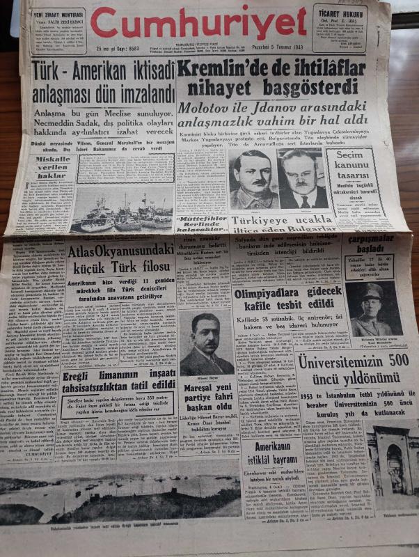Cumhuriyet Gazetesi - 5 Temmuz 1948 - Miskalle Verilen Haklar Köşe Yazısı - Türk Amerikan İktisadi Anlaşması Dün İmzalandı - Kremlinde de İhtilaflar Nihayet Başgösterdi - Hikmet Bayur Millet Partisi Lideri Seçildi - Seçim Kanunu Tasarısı - İstanbul Üniversitesinin 500. Yıldönümü - Olimpiyatlara Gidecek Kafile Tespit Edildi - Türk Güreşine İlaveler Yazan İsmail Habib Sevük - Bakırköy Panaroma Bahçesinde İsmail Dümbüllü Tiyatrosu Ve Müzeyyen Senar Işıl - Ramazanda Pide İmaline Müsaade Edildi - Nasıl Yazmalı Yazan Burhan Felek Köşe Yazısı - Amerika'da Komünist Aleyhtarı Bir İşçi Birliği Kuruluyor - Çapamarka - Derman Ağrı Kesici - Otokar - Bugünkü Radyo Programı - Armstrong Lastikleri - Philips Floresan