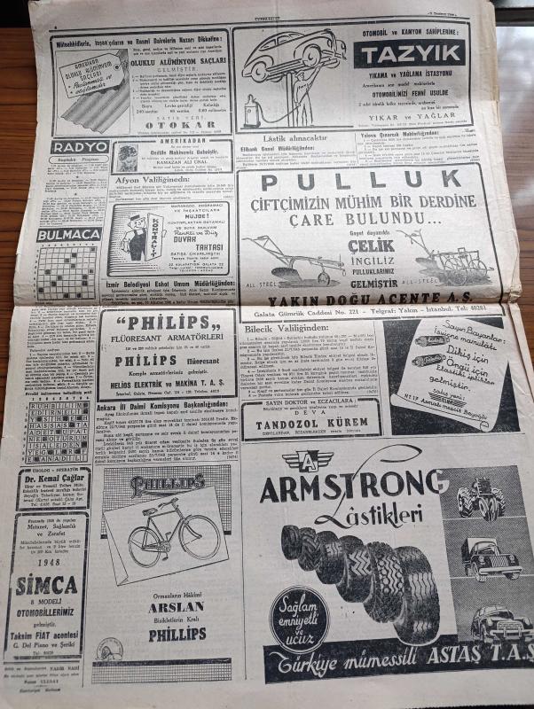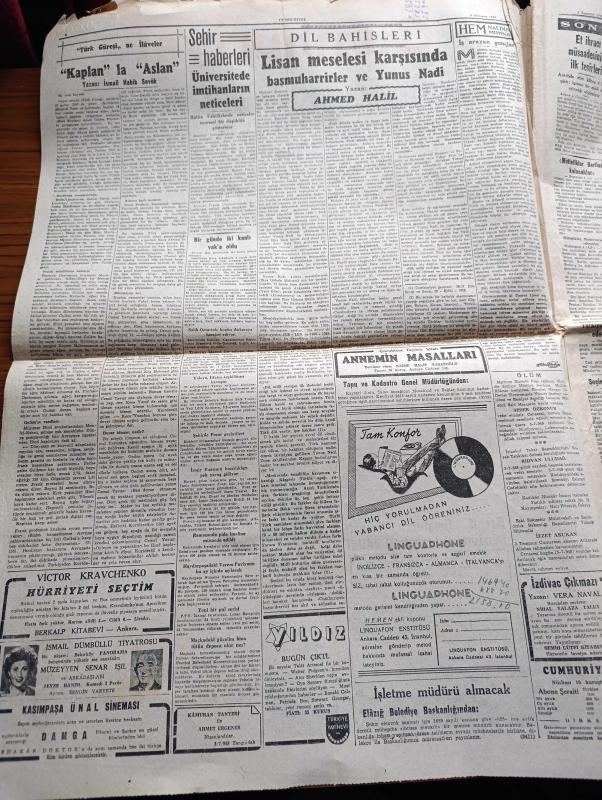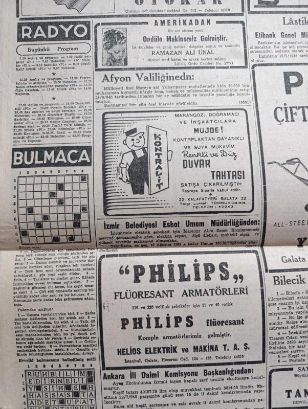 Cumhuriyet Gazetesi - 5 Temmuz 1948 - Miskalle Verilen Haklar Köşe Yazısı - Türk Amerikan İktisadi Anlaşması Dün İmzalandı - Kremlinde de İhtilaflar Nihayet Başgösterdi - Hikmet Bayur Millet Partisi Lideri Seçildi - Seçim Kanunu Tasarısı - İstanbul Üniversitesinin 500. Yıldönümü - Olimpiyatlara Gidecek Kafile Tespit Edildi - Türk Güreşine İlaveler Yazan İsmail Habib Sevük - Bakırköy Panaroma Bahçesinde İsmail Dümbüllü Tiyatrosu Ve Müzeyyen Senar Işıl - Ramazanda Pide İmaline Müsaade Edildi - Nasıl Yazmalı Yazan Burhan Felek Köşe Yazısı - Amerika'da Komünist Aleyhtarı Bir İşçi Birliği Kuruluyor - Çapamarka - Derman Ağrı Kesici - Otokar - Bugünkü Radyo Programı - Armstrong Lastikleri - Philips Floresan, Yunus Nadi tarafından kaleme alınmıştır. Cumhuriyet Gazetesi - 5 Temmuz 1948 - Miskalle Verilen Haklar Köşe Yazısı - Türk Amerikan İktisadi Anlaşması Dün İmzalandı - Kremlinde de İhtilaflar Nihayet Başgösterdi - Hikmet Bayur Millet Partisi Lideri Seçildi - Seçim Kanunu Tasarısı - İstanbul Üniversitesinin 500. Yıldönümü - Olimpiyatlara Gidecek Kafile Tespit Edildi - Türk Güreşine İlaveler Yazan İsmail Habib Sevük - Bakırköy Panaroma Bahçesinde İsmail Dümbüllü Tiyatrosu Ve Müzeyyen Senar Işıl - Ramazanda Pide İmaline Müsaade Edildi - Nasıl Yazmalı Yazan Burhan Felek Köşe Yazısı - Amerika'da Komünist Aleyhtarı Bir İşçi Birliği Kuruluyor - Çapamarka - Derman Ağrı Kesici - Otokar - Bugünkü Radyo Programı - Armstrong Lastikleri - Philips Floresan adlı eser Türkçe dilindedir.