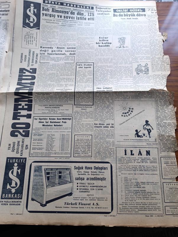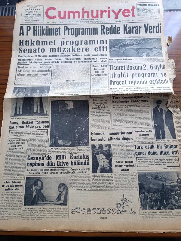 Cumhuriyet Gazetesi - 5 Temmuz 1962 - Adalet Partisi Hükümet Programını Redde Karar Verdi - Hasankeyf'de Yapılacak Üç Kemerli Köprü - Ticaret Bakanı Muhlis Ete 2. 6 Aylık İthalat Programı Ve İhracat Rejimini Açıkladı - Genelkurmay Başkanı Orgeneral Cevdet Sunay Brüksel Toplantısı İçin Olmaz Böyle Şey Dedi - Cezayir'de Milli Kurtuluş Cephesi Dün İkiye Bölündü - Soruşturma Komisyonu Mehmet Baydur'u Suçsuz Buldu - Adana Trenine Sabotaj Yapılmak İstendi - İlhan Selçuk Köşe Yazısı - Esat Tekeli Köşe Yazısı - Gecenin Ucundaki Işık Yazan Peride Celal Yazı Dizisi - Deniz Hastanesi - Esrar İçilen Bir Kulüp Basıldı - Başkan Kennedy Atom Savaşı Değil Gerilla Savaşı İçin Hazırlanmalı Dedi - Irak'ta 23 Yabancı Şirket Kapatıldı - İstanbul Ankara Radyosu Programı - 303 Gün Süren Milli Lig Maratonundan Notlar - En Az Gol Yiyen Takım Galatasaray - En Çok Gol Atan Takım Fenerbahçe - Transfere Futbolcu Değil Kulüp Hegemonyası Hakim - Federasyon Kupası Kürek Yarışmaları Çekişmeli Geçecek -- Korem Bayer adlı eser, Kitap > Süreli Yayınlar > Gazeteler > Türkiye > Genel > Günlük kategorisinde İkinci El olarak satıştadır.