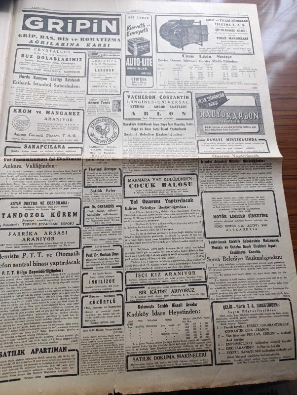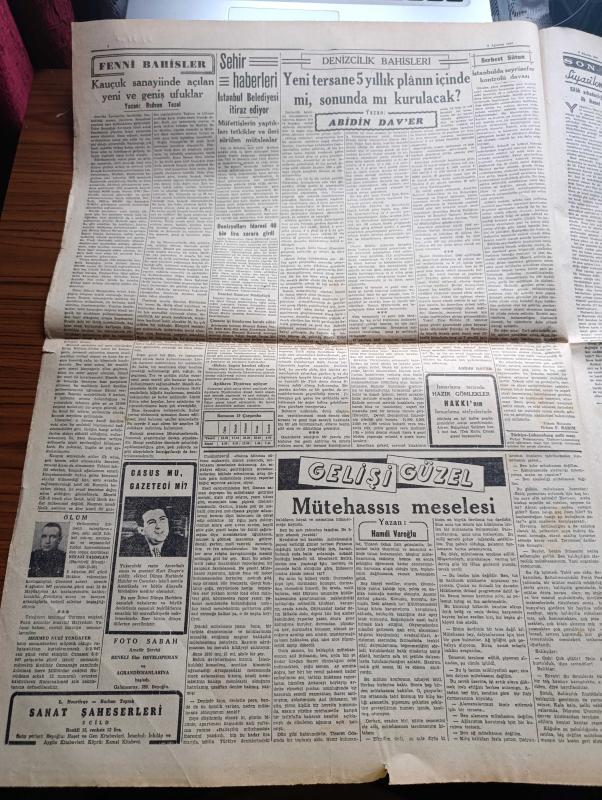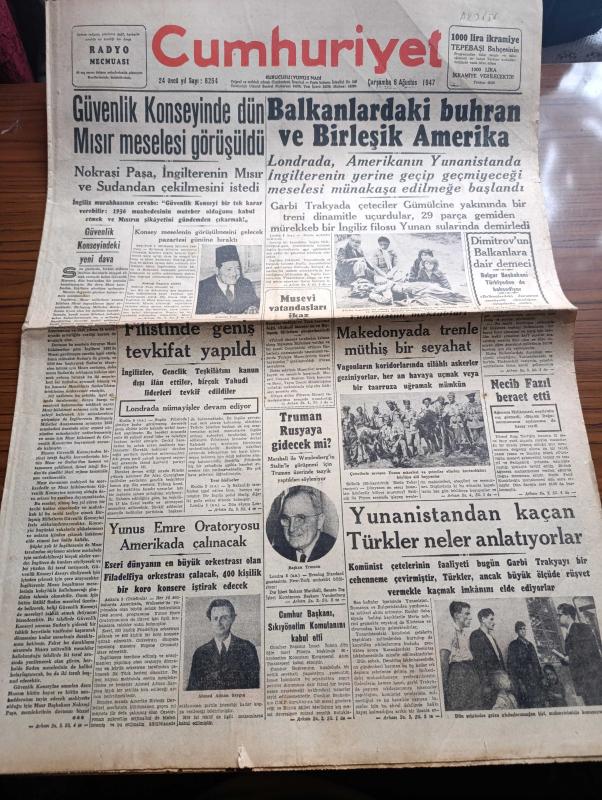 Cumhuriyet Gazetesi - 6 Ağustos 1947 - Yunus Emre Oratoryosu Amerikada Çalınacak - Ahmed Adnan Saygın Fotoğraf - Güvenlik Konseyinde Dün Mısır Meselesi Görüşüldü - Filistin'de Geniş Bir Tevkifat Yapıldı - Balkanlarda Buhran Ve Birleşik Amerika - Çetelerle Savaşan Yunan Askerleri - Yunanistan'dan Kaçan Türkler Neler Anlatıyorlar - Cumhurbaşkanı İsmet İnönü Sıkıyönetim Komutanı Korgeneral Asım Tınaztepeyi Kabul Etti - Necip Fazıl Kısakürek Beraat Etti - Musevi Vatandaşlara İkaz - Yeni Tersane 5 Yıllık Planın İçinde Mi Kurulacaktır Sonunda Mı Kurulacak Yazan Abidin Daver Köşe Yazısı - Yabancı Kadın Yazan Ahmet Hidayet Reel Yazı Dizisi - Bizde İşsizlik Hasan Burhan Felek Köşe Yazısı - Münir Nurettin Selçuk Caddebostan Ayten Gazinosunda - Kemal Sahir Sadi Şener Tiyatrosu Lale Bahçesinde - Gripin - Çapa Temizleme Tozu - Bugünkü Radyo Programı - Bulmaca - Şekerci Hacı Muhiddin Hacı Bekir adlı eser, Kitap > Süreli Yayınlar > Gazeteler > Türkiye > Genel > Günlük kategorisinde İkinci El olarak satıştadır.