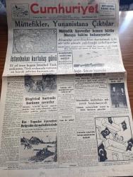 Cumhuriyet Gazetesi - 6 Birinciteşrin (Ekim) 1944 - İstanbul'un kurtuluş günü yazan Abidin Daver Başmakale - müttefikler Yunanistan'a çıktılar - Yunanistan topraklarını ve müttefiklerin çıktıkları Mora'yı gösterir harita - Avusturya'da ayaklanma Şayiaları - Goebbels'in Yeni Nutku - Akdeniz'de Bir Tayyare gemisinden havalanan müttefik uçakları Yunan topraklarına doğru uçarlarken fotoğraf - Alman hududunda bir muharebe sahnesi - İtalya'ya eski müstemlekeleri geri verilecek mi - Anglosakson basınında Bulgaristana hücumlar - İstanbul'da mektepsiz tek çocuk bırakılmayacak - İngiltere'nin yeni büyükelçisi Sir Maurice Patterson Ankara'da fotoğraf - Sovyet kuvvetlerinin taarruz ettikleri Bir köyde savaş Fotoğraf - Fransa'da vatan hainlerinin muhakemesine başlandı - idam Saati filmi başrollerde Yusuf Vehbi Emine Rızık ve Hüseyin Sıtkı Taksim Sinemasında - Paris'in kurtuluşu filmi Kadıköy Süreyya sinemasında - Ankara at yarışlarının üçüncü haftası programı - Beyoğlu kitap sarayı açıldı adlı eser, Kitap > Süreli Yayınlar > Gazeteler > Türkiye > Genel > Günlük kategorisinde İkinci El olarak satıştadır.