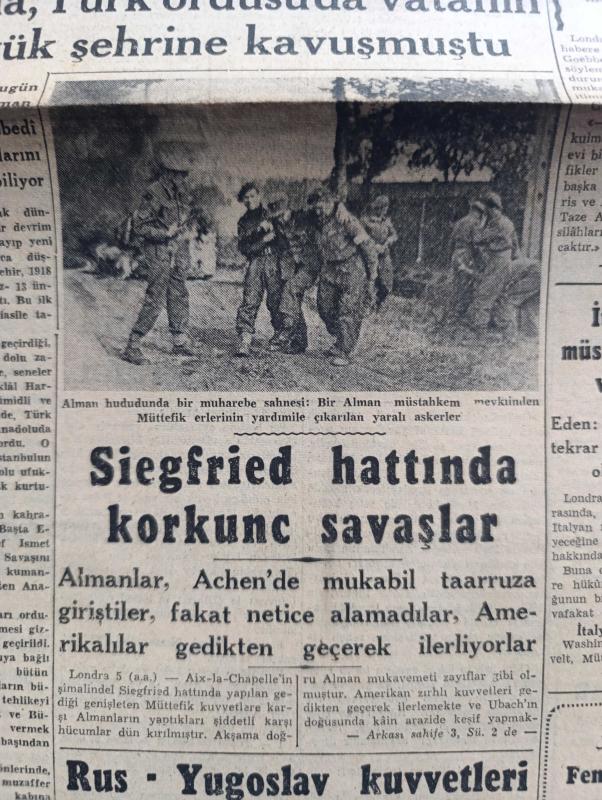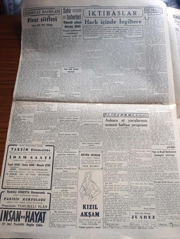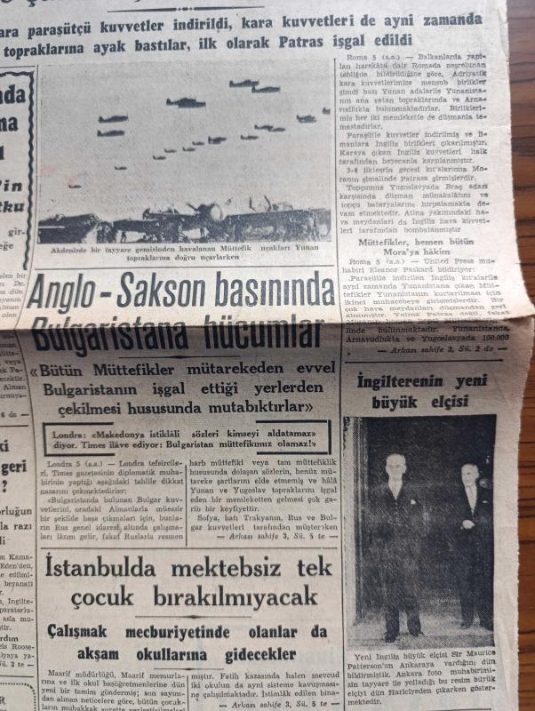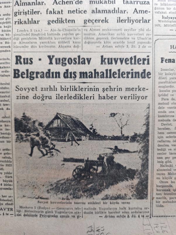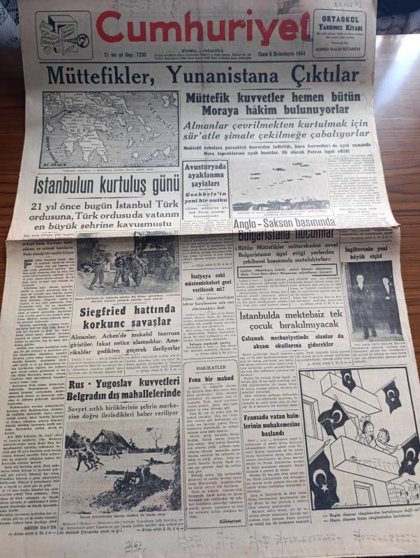 Cumhuriyet Gazetesi - 6 Birinciteşrin (Ekim) 1944 - İstanbul'un kurtuluş günü yazan Abidin Daver Başmakale - müttefikler Yunanistan'a çıktılar - Yunanistan topraklarını ve müttefiklerin çıktıkları Mora'yı gösterir harita - Avusturya'da ayaklanma Şayiaları - Goebbels'in Yeni Nutku - Akdeniz'de Bir Tayyare gemisinden havalanan müttefik uçakları Yunan topraklarına doğru uçarlarken fotoğraf - Alman hududunda bir muharebe sahnesi - İtalya'ya eski müstemlekeleri geri verilecek mi - Anglosakson basınında Bulgaristana hücumlar - İstanbul'da mektepsiz tek çocuk bırakılmayacak - İngiltere'nin yeni büyükelçisi Sir Maurice Patterson Ankara'da fotoğraf - Sovyet kuvvetlerinin taarruz ettikleri Bir köyde savaş Fotoğraf - Fransa'da vatan hainlerinin muhakemesine başlandı - idam Saati filmi başrollerde Yusuf Vehbi Emine Rızık ve Hüseyin Sıtkı Taksim Sinemasında - Paris'in kurtuluşu filmi Kadıköy Süreyya sinemasında - Ankara at yarışlarının üçüncü haftası programı - Beyoğlu kitap sarayı açıldı, Yunus Nadi tarafından kaleme alınmıştır. Cumhuriyet Gazetesi - 6 Birinciteşrin (Ekim) 1944 - İstanbul'un kurtuluş günü yazan Abidin Daver Başmakale - müttefikler Yunanistan'a çıktılar - Yunanistan topraklarını ve müttefiklerin çıktıkları Mora'yı gösterir harita - Avusturya'da ayaklanma Şayiaları - Goebbels'in Yeni Nutku - Akdeniz'de Bir Tayyare gemisinden havalanan müttefik uçakları Yunan topraklarına doğru uçarlarken fotoğraf - Alman hududunda bir muharebe sahnesi - İtalya'ya eski müstemlekeleri geri verilecek mi - Anglosakson basınında Bulgaristana hücumlar - İstanbul'da mektepsiz tek çocuk bırakılmayacak - İngiltere'nin yeni büyükelçisi Sir Maurice Patterson Ankara'da fotoğraf - Sovyet kuvvetlerinin taarruz ettikleri Bir köyde savaş Fotoğraf - Fransa'da vatan hainlerinin muhakemesine başlandı - idam Saati filmi başrollerde Yusuf Vehbi Emine Rızık ve Hüseyin Sıtkı Taksim Sinemasında - Paris'in kurtuluşu filmi Kadıköy Süreyya sinemasında - Ankara at yarışlarının üçüncü haftası programı - Beyoğlu kitap sarayı açıldı adlı eser Türkçe dilindedir.