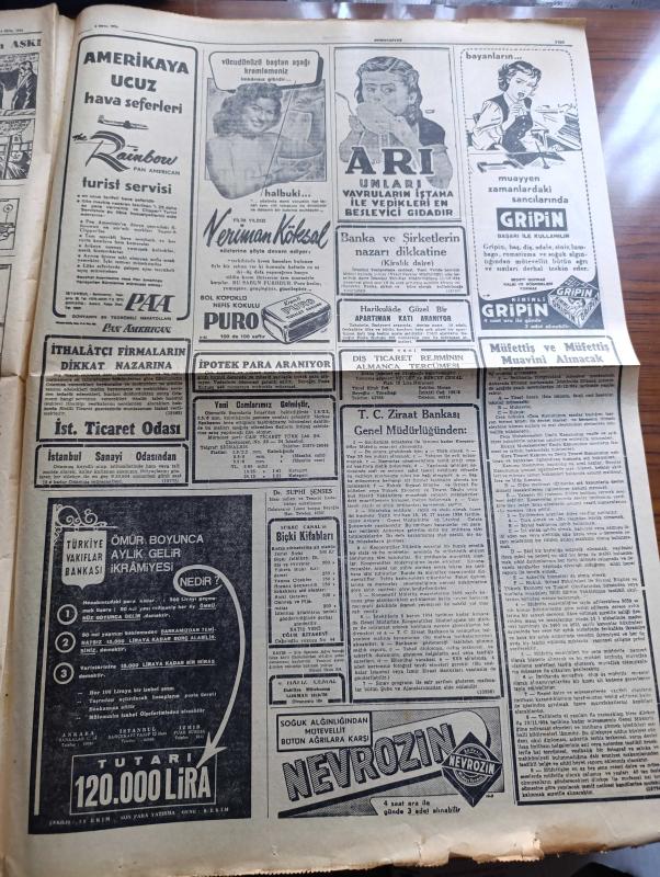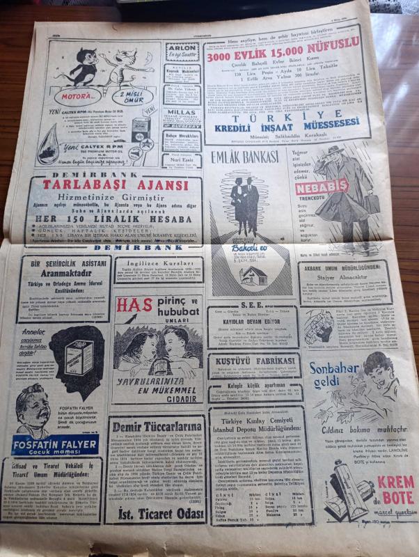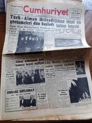 Cumhuriyet Gazetesi - 6 Ekim 1954 - Türk Alman iktisadi görüşmeleri dün başladı - başvekilimiz Adnan Menderes'in Dün Federal Almanya meclis reisini ziyaretinde çekilen fotoğraf - İstanbul'un kurtuluş günü - Celal Bayar'ın Karadeniz seyahati - Fransa semalarını uçan daireler istila etti - Alman ordusunun yeni komuta heyeti seçiliyor - Arsenal Moskova'da 5-0 yenildi - Trieste Anlaşması imzalandı - 1001 Kuyu Yazan Va Nü yazı dizisi - Atatürk Üniversitesi için tetkikler yapan heyet Diyarbakır'da - Kıbrıs Türkiye'ye aittir - refahı körüklüyoruz yazan Burhan Felek - İstanbul profesyonel lig maçları fikstürü - milli takım bugün Beşiktaş'ta karşılaşacak - meşhur Fransız yüzücüsü Vallery öldü - Bahçeden Bir Adam Girdi yazan Perihan Zorlu Yazı Dizisi - İstanbul Ankara radyo programı - küçük sahnede oynanacak oyunlar - Film Yıldızı Neriman Köksal Puro Tuvalet Sabunu Kullanıyor - milli talebe Federasyonu ile Milli Türk Talebe Birliği birleştiriliyor - Demirbank Tarlabaşı Ajansı açıldı adlı eser, Kitap > Süreli Yayınlar > Gazeteler > Türkiye > Genel > Günlük kategorisinde İkinci El olarak satıştadır.