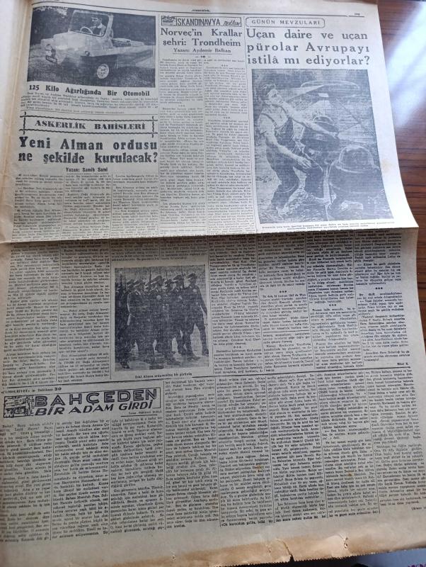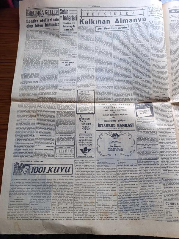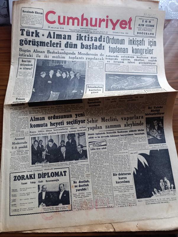 Cumhuriyet Gazetesi - 6 Ekim 1954 - Türk Alman iktisadi görüşmeleri dün başladı - başvekilimiz Adnan Menderes'in Dün Federal Almanya meclis reisini ziyaretinde çekilen fotoğraf - İstanbul'un kurtuluş günü - Celal Bayar'ın Karadeniz seyahati - Fransa semalarını uçan daireler istila etti - Alman ordusunun yeni komuta heyeti seçiliyor - Arsenal Moskova'da 5-0 yenildi - Trieste Anlaşması imzalandı - 1001 Kuyu Yazan Va Nü yazı dizisi - Atatürk Üniversitesi için tetkikler yapan heyet Diyarbakır'da - Kıbrıs Türkiye'ye aittir - refahı körüklüyoruz yazan Burhan Felek - İstanbul profesyonel lig maçları fikstürü - milli takım bugün Beşiktaş'ta karşılaşacak - meşhur Fransız yüzücüsü Vallery öldü - Bahçeden Bir Adam Girdi yazan Perihan Zorlu Yazı Dizisi - İstanbul Ankara radyo programı - küçük sahnede oynanacak oyunlar - Film Yıldızı Neriman Köksal Puro Tuvalet Sabunu Kullanıyor - milli talebe Federasyonu ile Milli Türk Talebe Birliği birleştiriliyor - Demirbank Tarlabaşı Ajansı açıldı, Yunus Nadi tarafından kaleme alınmıştır. Cumhuriyet Gazetesi - 6 Ekim 1954 - Türk Alman iktisadi görüşmeleri dün başladı - başvekilimiz Adnan Menderes'in Dün Federal Almanya meclis reisini ziyaretinde çekilen fotoğraf - İstanbul'un kurtuluş günü - Celal Bayar'ın Karadeniz seyahati - Fransa semalarını uçan daireler istila etti - Alman ordusunun yeni komuta heyeti seçiliyor - Arsenal Moskova'da 5-0 yenildi - Trieste Anlaşması imzalandı - 1001 Kuyu Yazan Va Nü yazı dizisi - Atatürk Üniversitesi için tetkikler yapan heyet Diyarbakır'da - Kıbrıs Türkiye'ye aittir - refahı körüklüyoruz yazan Burhan Felek - İstanbul profesyonel lig maçları fikstürü - milli takım bugün Beşiktaş'ta karşılaşacak - meşhur Fransız yüzücüsü Vallery öldü - Bahçeden Bir Adam Girdi yazan Perihan Zorlu Yazı Dizisi - İstanbul Ankara radyo programı - küçük sahnede oynanacak oyunlar - Film Yıldızı Neriman Köksal Puro Tuvalet Sabunu Kullanıyor - milli talebe Federasyonu ile Milli Türk Talebe Birliği birleştiriliyor - Demirbank Tarlabaşı Ajansı açıldı adlı eser Türkçe dilindedir.