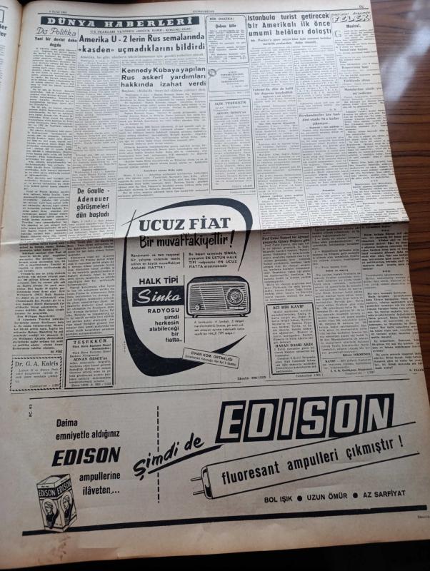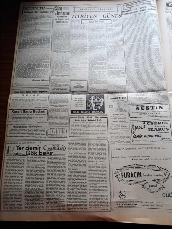 Cumhuriyet Gazetesi - 6 Eylül 1962 - Adalet Partisinin Planı Red Edeceğine Kaani Olan İktidar Acele Tedbir Alıyor - 5 Yıllık Planı Redde Hazırlanan Adalet Partisi Grubu - İran'dan Sonra Doğu İllerimizde Deprem - Komünistlikle İtham Edilince Orhan Apaydın Partisinden İstifa Etti - Yeni Türkiye Partisi İle Cumhuriyetçi Köylü Millet Partisi'nin Birleşmesi Gerçekleşiyor - Şehirlerarası Otobüslerde Film Oynatılmaya Başlandı - Adalet Partisi EMİNSU'ların Orduya Dönmeleri İçin Kanun Tasarısı Hazırladı - Yabancı Uyruklu Kadınla Evlenen Yedek Subay Olabilecek - Yer Demir Gök Bakır Yazan Yaşar Kemal Yazı Dizisi - Türkiye'de Köy Enstitüleri Yazan İlhan Selçuk - Amerika U 2 lerin Rus Semalarında Uçmadıklarını Bildirdi - Kennedy Küba'ya Yapılan Rus Askeri Yardımları Hakkında İzahat Verdi - Osmanlı Tarihinde Haydut Aşkları Yazan Reşat Ekrem Koçu Yazı Dizisi - Gecenin Ucundaki Işık Yazan Peride Celal Yazı Dizisi - Metin Oktay'ın Ayak Bileği Sakat Futbolcular Dün Çalıştılar - Şeref Has, Yunus Nadi tarafından kaleme alınmıştır. Cumhuriyet Gazetesi - 6 Eylül 1962 - Adalet Partisinin Planı Red Edeceğine Kaani Olan İktidar Acele Tedbir Alıyor - 5 Yıllık Planı Redde Hazırlanan Adalet Partisi Grubu - İran'dan Sonra Doğu İllerimizde Deprem - Komünistlikle İtham Edilince Orhan Apaydın Partisinden İstifa Etti - Yeni Türkiye Partisi İle Cumhuriyetçi Köylü Millet Partisi'nin Birleşmesi Gerçekleşiyor - Şehirlerarası Otobüslerde Film Oynatılmaya Başlandı - Adalet Partisi EMİNSU'ların Orduya Dönmeleri İçin Kanun Tasarısı Hazırladı - Yabancı Uyruklu Kadınla Evlenen Yedek Subay Olabilecek - Yer Demir Gök Bakır Yazan Yaşar Kemal Yazı Dizisi - Türkiye'de Köy Enstitüleri Yazan İlhan Selçuk - Amerika U 2 lerin Rus Semalarında Uçmadıklarını Bildirdi - Kennedy Küba'ya Yapılan Rus Askeri Yardımları Hakkında İzahat Verdi - Osmanlı Tarihinde Haydut Aşkları Yazan Reşat Ekrem Koçu Yazı Dizisi - Gecenin Ucundaki Işık Yazan Peride Celal Yazı Dizisi - Metin Oktay'ın Ayak Bileği Sakat Futbolcular Dün Çalıştılar - Şeref Has adlı eser Türkçe dilindedir.