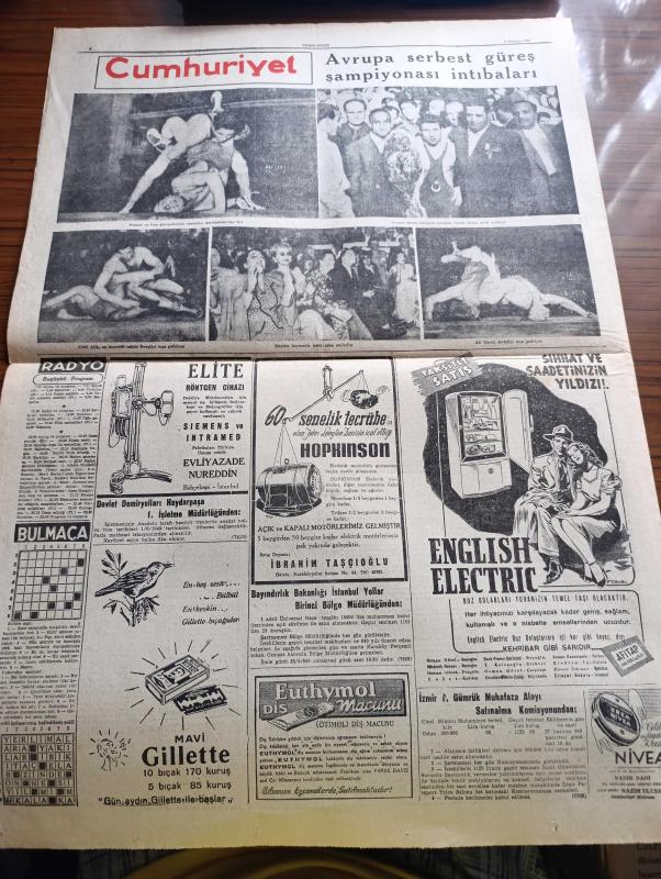 Cumhuriyet Gazetesi - 6 Haziran 1949 - Celal Bayar'ın Dün Ankara'da yaptığı konuşma - Marshall planının ikinci yıldönümü - serbest güreşte Avrupa şampiyonluğunu kazandık - 73 kiloda Avrupa birincisi olan Celal Atik Şeref kürsüsünde fotoğraf - Güreş Şampiyonası neticeleri - Vali Doktor Lütfi Kırdar 57 kilo şampiyonu Nasuh Akar'a mükafatını veriyor fotoğraf - Beşiktaş Rangers'ı dün 4-0 yendi fotoğraf - Rusya'da ölen kuryemiz Fuat Güzaltan - güreşleri Bütün Türkiye'ye anlatan Eşref Şefik'in intibaları - Türkiye Futbol Şampiyonası - Viz Zan De Rujları - Avrupa serbest güreş şampiyonası intibaları fotoğrafları - maçları heyecanla takip eden seyirciler fotoğraf - Ali Yücel isveçliyi tuşa getiriyor fotoğraf - bugünkü radyo programı - bulmaca - Gillette Traş Bıçakları - Nivea Krem - Ankara'daki Türkçe futbol şampiyonasında Ankaragücü birinci Galatasaray ikinci oldu - Osmanlı Bankası - Suriye'de seçim - bu kapıyı açmayınız yazan Anthony Gilbert Yazı Dizisi - Fransız Dışişleri Bakanı Schuman adlı eser, Kitap > Süreli Yayınlar > Gazeteler > Türkiye > Genel > Günlük kategorisinde İkinci El olarak satıştadır.