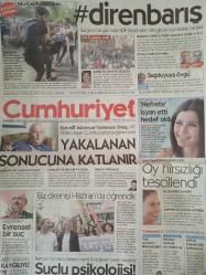 Cumhuriyet Gazetesi,6 Haziran 2015,Cevat Öneş,Beren Saat,Recep Tayyip Erdoğan,Ahmet Davutoğlu,Kemal Kılıçdaroğlu,Devlet Bahçeli,Ebru Katar,Dündar,Messi,Demba Ba,Hamza Hamzaoğlu,Cüneyt Çakır adlı eser Türkçe dilindedir.