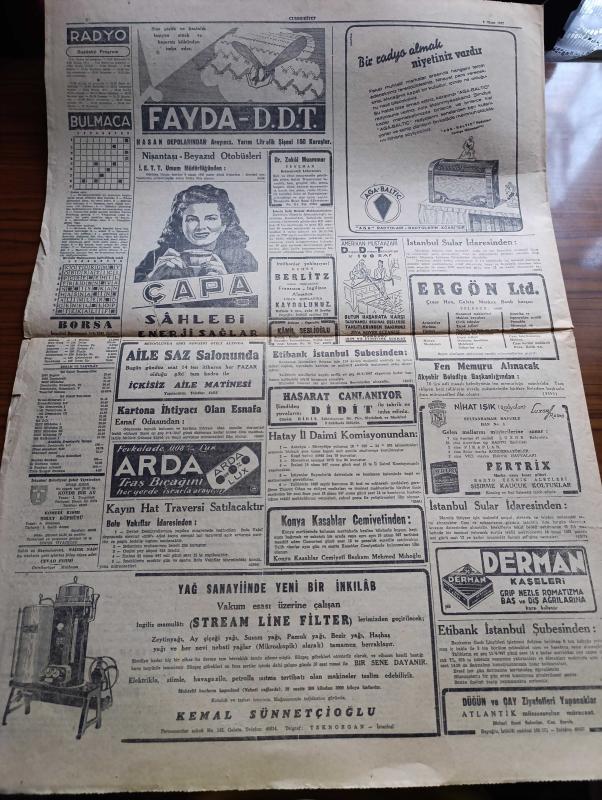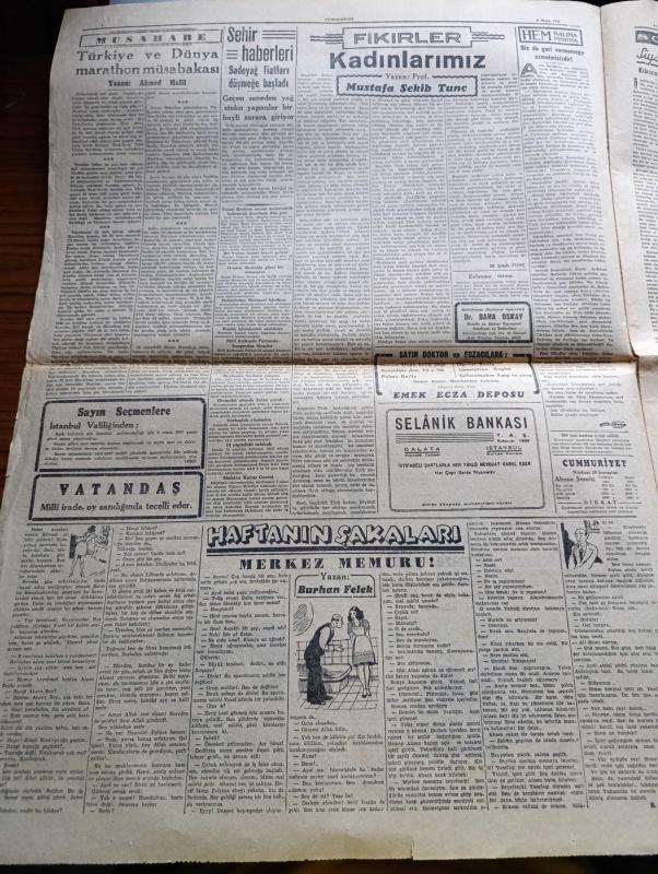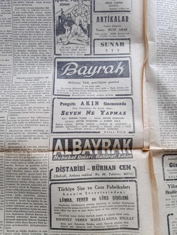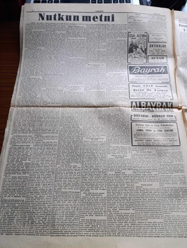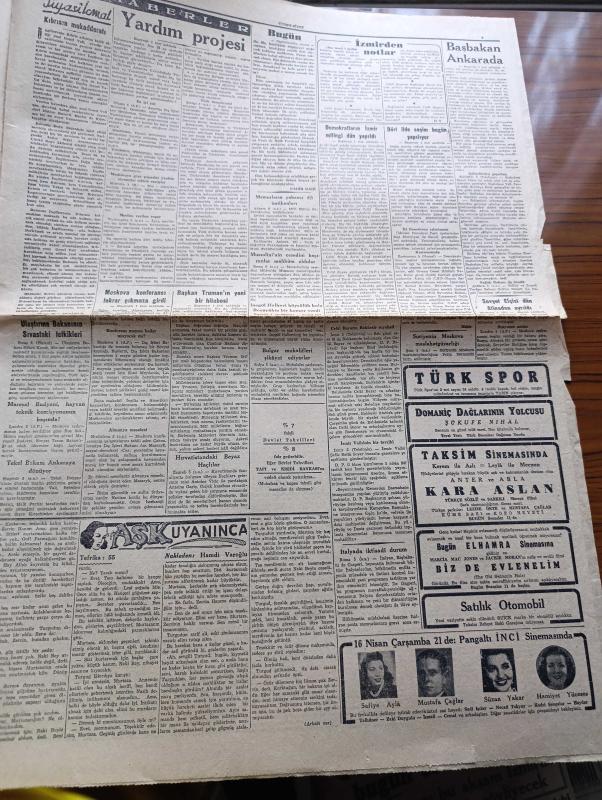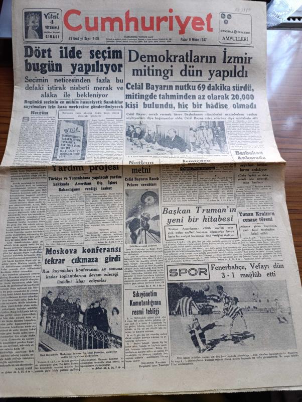 Cumhuriyet Gazetesi - 6 Nisan 1947 - Bugün Yazan Nadir Nadi Köşe Yazısı - Dört İlde Seçim Bugün Yapılıyor - Demokratların İzmir Mitingi Dün Yapıldı - Celal Bayar'ın Nutku 69 Dakika Sürdü - Mitingde Tahminden Az Olarak 20,000 Kişi Bulundu Hadise Olmadı - Celal Bayar'ın Recep Peker'e Cevapları - Türkiye Ve Yunanistan'a Yapılacak Yardım Hakkında Amerikan Dışişleri Bakanlığının Verdiği İzahat - Fenerbahçe Vefa'yı Dün 3 1 Mağlup Etti Fotoğraf - Yunan Kralı George'in Cenaze Töreni - Başkan Truman'ın Yeni Bir Hitabesi - Türkiye Ve Dünya Maraton Müsabakası Yazan Ahmed Halil - Haftanın Şakaları Yazan Burhan Felek - Aşk Uyanınca Nakleden Hamdi Varoğlu Yazı Dizisi - Safiye Ayla Mustafa Çağlar Suzan Yakar Ve Hamiyet Yüceses Pangaltı İnci Sinemasında - Albayrak Hububat Unları - Bayrak Milliyetçi Türk Gençliğinin Gazetesi - Çapa Sahlebi Enerji Sağlar - Aga Radyoları - Bugünkü Radyo Programı - Bulmaca - Borsa - Haşeratlara Karşı Didit - Arda Traş Bıçağı adlı eser, Kitap > Süreli Yayınlar > Gazeteler > Türkiye > Genel > Günlük kategorisinde İkinci El olarak satıştadır.