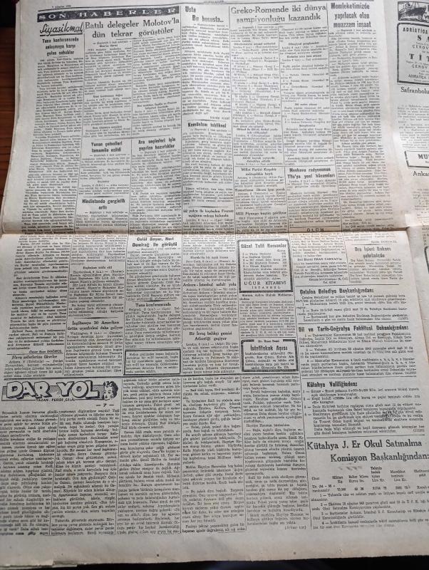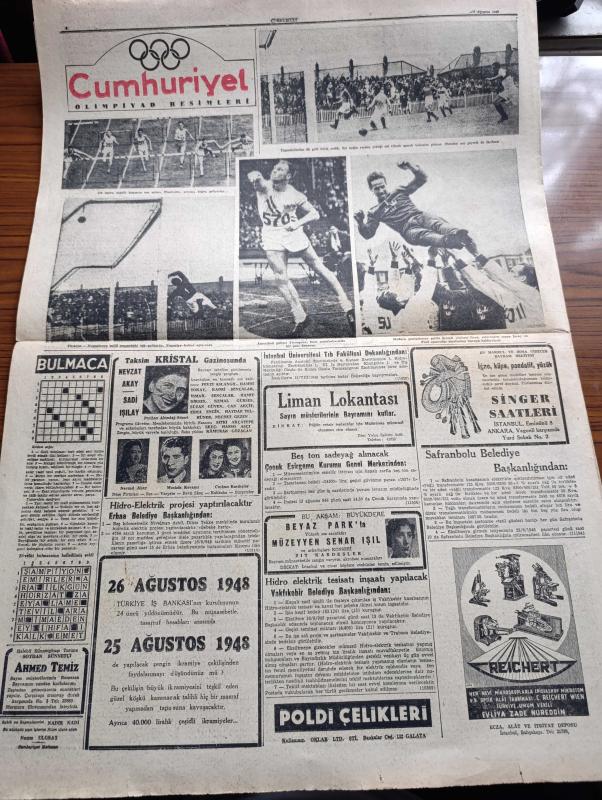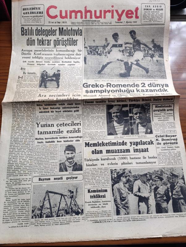 Cumhuriyet Gazetesi - 7 Ağustos 1948 - Usta Bu Hususta Yazan Nadir Nadi Köşe Yazısı - Batılı Delegeler Molotovla Dün Tekrar Görüştüler - Ara Seçimleri İçin Yapılan Hazırlıklar - Grekoromende 2 Dünya Şampiyonluğu Kazandık - Yugoslavya Türkiye Milli Maçında Sağ Hafımız Naci Yugoslavya Akınını Durduruyor Fotoğraf - Bayram Neşeli Geçiyor Fotoğraf - Türkiye'de Kurulacak 1000 Hastane İle Banka Binaları Ve Evlerin Planları Tamamlanıyor - Demokrat Parti Genel Başkanı Celal Bayar Nuri Demirağ İle Görüştü - Grekoromende Şampiyon Olan İki Güreşçimiz Mersinli Ahmed Ve Mehmet Oktav Fotoğraf - Taksim Belediye Gazinosunda Zıt Kardeşler - Olimpiyatlarda Felek Yazan Burhan Felek - Alev Gibi Yazan James Hilton Yazı Dizisi - 1948 1949 Yunus Nadi Mükafatı Atatürk'e Ait Bir Hatıra - Dar Yol Yazan Peride Celal Yazı Dizisi - Limanımıza Gelen Giden Vapurlar - Cumhuriyet Olimpiyat Resimleri - Amerikalı Gülleci Thompson Fotoğraf - Modern Pentatlon Galibi İsveçli Yüzbaşı Grut Fotoğraf - Müzeyyen Senar Işıl adlı eser, Kitap > Süreli Yayınlar > Gazeteler > Türkiye > Genel > Günlük kategorisinde İkinci El olarak satıştadır.