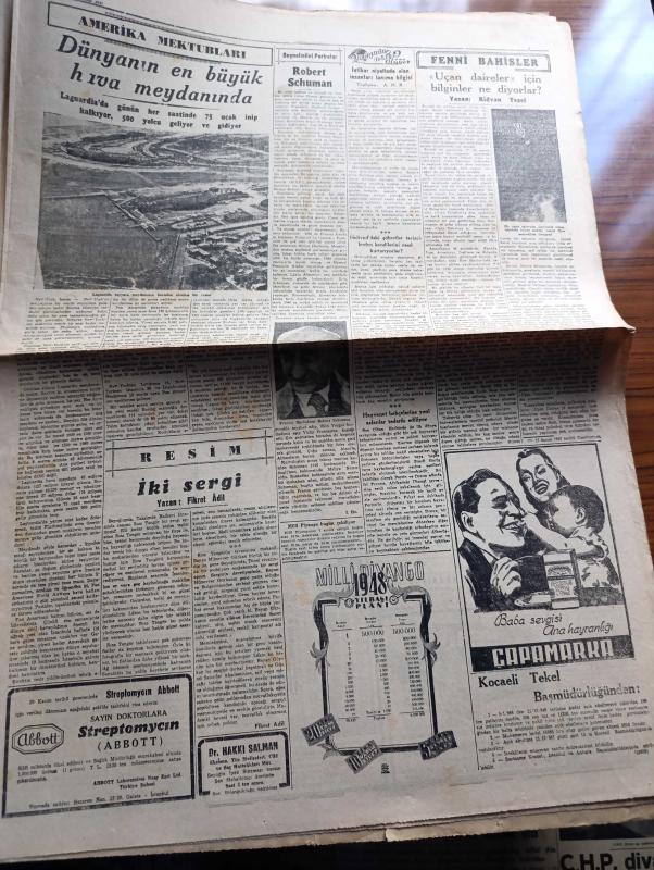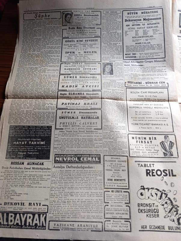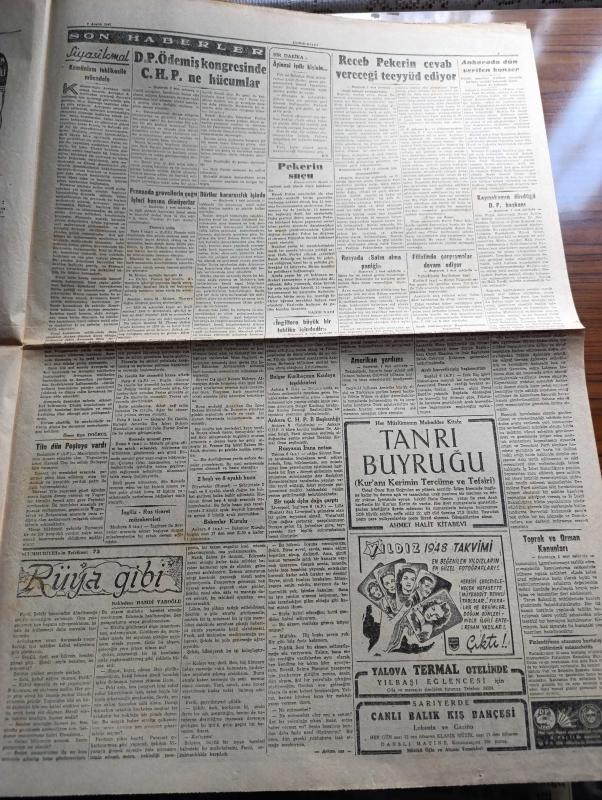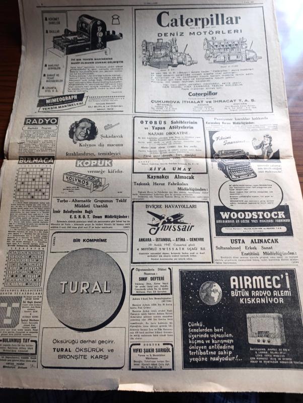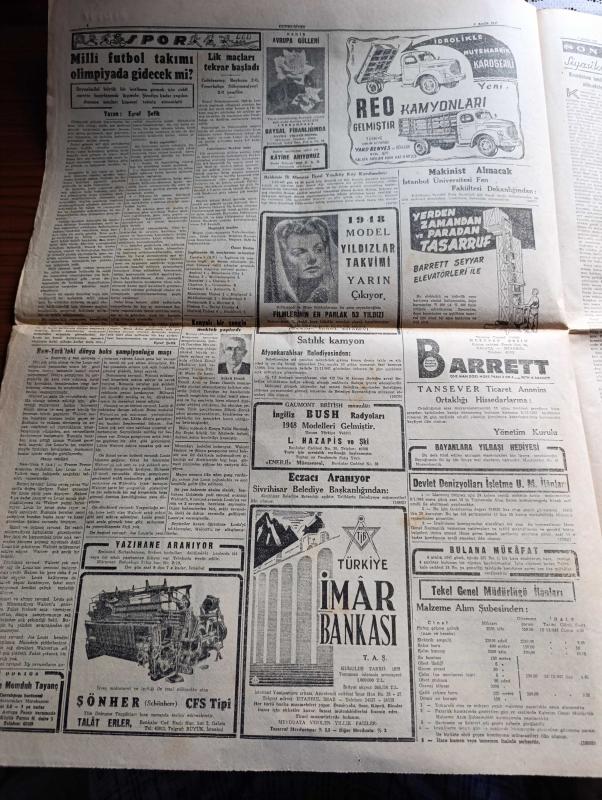 Cumhuriyet Gazetesi - 7 Aralık 1947 - Recep Peker'in suçu yazan Nadir Nadi Başmakale - Recep Peker'in cevap vereceği teeyyüd ediyor - Londra'da dörtler Avusturya bir Almanya meselelerini görüşürlerken fotoğraf - Fransa'da grevcilerin çoğu işleri başına dönüyorlar - Fransız milli meclisinde komünist lideri Thorez'in sözleri yuhalarla karşılandı - New York'ta Joe Louis ile Walcott arasında Dünya Boks şampiyonluğu maçı fotoğraf - Filistin'de çarpışmalar devam ediyor - haftanın şakaları yazan Burhan Felek - dünyanın en büyük hava meydanı Laguardia fotoğraf - uçan daireler için bilgiler Ne diyorlar yazan Rıdvan Tezel - milli futbol takımı olimpiyata gidecek mi yazan Eşref Şefik - Galatasaray Beykoz'u Fenerbahçe Süleymaniye'yi 2 0 Yendiler - 1948 model Yıldızlar Takvimi Yarın Çıkıyor - Safiye Ayla borsa kıraathanesinde - gönül kimi severse filmi İpek ve Melek sinemasında - patinaj Kralı filmi bugün elhamra sinemasında - bugünkü radyo programı - İstanbul belediyesi şehir tiyatroları programı adlı eser, Kitap > Süreli Yayınlar > Gazeteler > Türkiye > Genel > Günlük kategorisinde İkinci El olarak satıştadır.