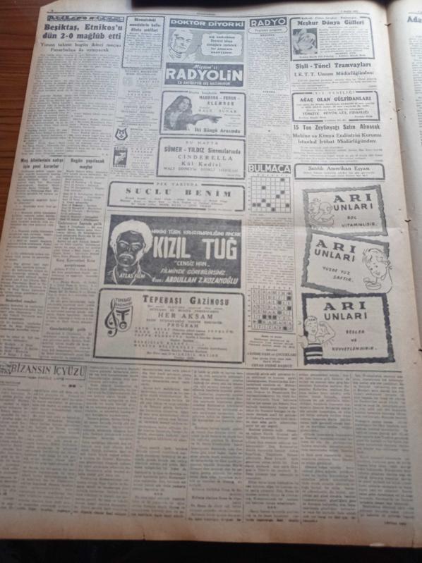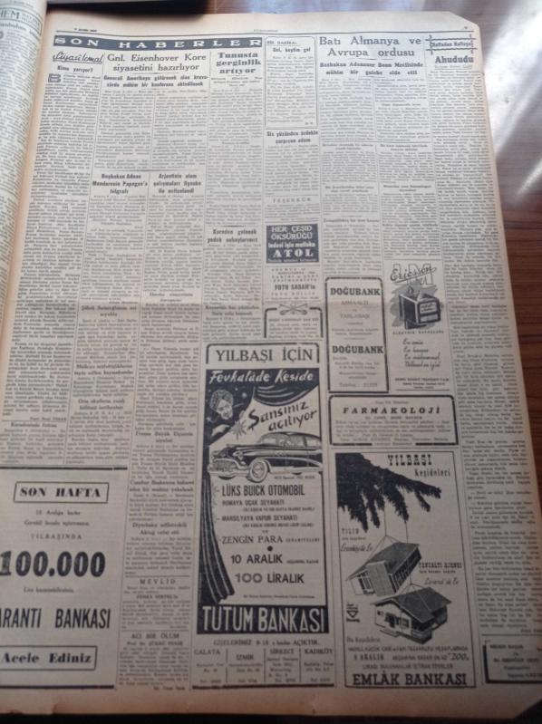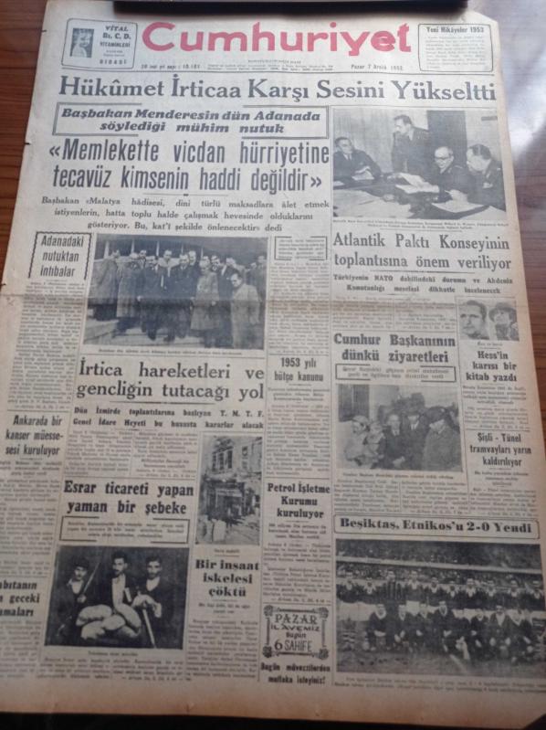 Cumhuriyet Gazetesi - 7 Aralık 1952 - Hükümet İrticaa Karşı Sesini Yükseltti - Başbakan Adnan Menderes Memlekette Vicdan Hürriyetine Tecavüz Kimsenin Haddi Değildir - Esrar Ticareti Yapan Bir Şebeke - Hitler'in Gözde Arkadaşı Hess'in Karısı Kitap Yazdı - Beşiktaş Etnikos'u 2 0 Yendi - 1953 Yılı Bütçe Kanunu - Ankara'da Bir Kanser Müessesi Kuruluyor - Cumhurbaşkanı Celal Bayar'ın Rami Göçmenevleri Ziyareti - General Eisenhower Kore Siyasetini Hazırlıyor - Kore'den Gelecek Yedek Subaylarımız - Eski Başbakanlardan Şükrü Saraçoğlu'nun Evi Soyuldu - Ericsson Elektrik Sayaçları - Radyolin Diş Macunu - Suçlu Benim Filmi Pek Yakında - Sadri Alışık - Feridun Çölgeçen - Galatasaray İzmir'de Galip - Şişli Tünel Tramvayları Yarın Kaldırılıyor - Arı Bisküvileri - Puro Tuvalet Sabunları - Hamiyet Yüceses Taksim Kristal'de - Nacar Saatleri - İsolan Dürbünleri, Yunus Nadi tarafından kaleme alınmıştır. Cumhuriyet Gazetesi - 7 Aralık 1952 - Hükümet İrticaa Karşı Sesini Yükseltti - Başbakan Adnan Menderes Memlekette Vicdan Hürriyetine Tecavüz Kimsenin Haddi Değildir - Esrar Ticareti Yapan Bir Şebeke - Hitler'in Gözde Arkadaşı Hess'in Karısı Kitap Yazdı - Beşiktaş Etnikos'u 2 0 Yendi - 1953 Yılı Bütçe Kanunu - Ankara'da Bir Kanser Müessesi Kuruluyor - Cumhurbaşkanı Celal Bayar'ın Rami Göçmenevleri Ziyareti - General Eisenhower Kore Siyasetini Hazırlıyor - Kore'den Gelecek Yedek Subaylarımız - Eski Başbakanlardan Şükrü Saraçoğlu'nun Evi Soyuldu - Ericsson Elektrik Sayaçları - Radyolin Diş Macunu - Suçlu Benim Filmi Pek Yakında - Sadri Alışık - Feridun Çölgeçen - Galatasaray İzmir'de Galip - Şişli Tünel Tramvayları Yarın Kaldırılıyor - Arı Bisküvileri - Puro Tuvalet Sabunları - Hamiyet Yüceses Taksim Kristal'de - Nacar Saatleri - İsolan Dürbünleri adlı eser Türkçe dilindedir.