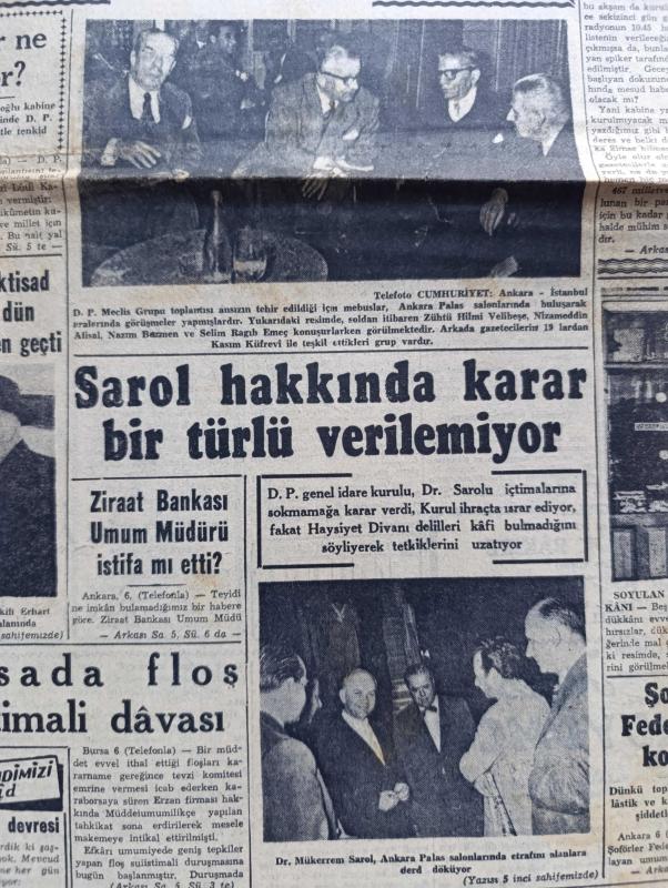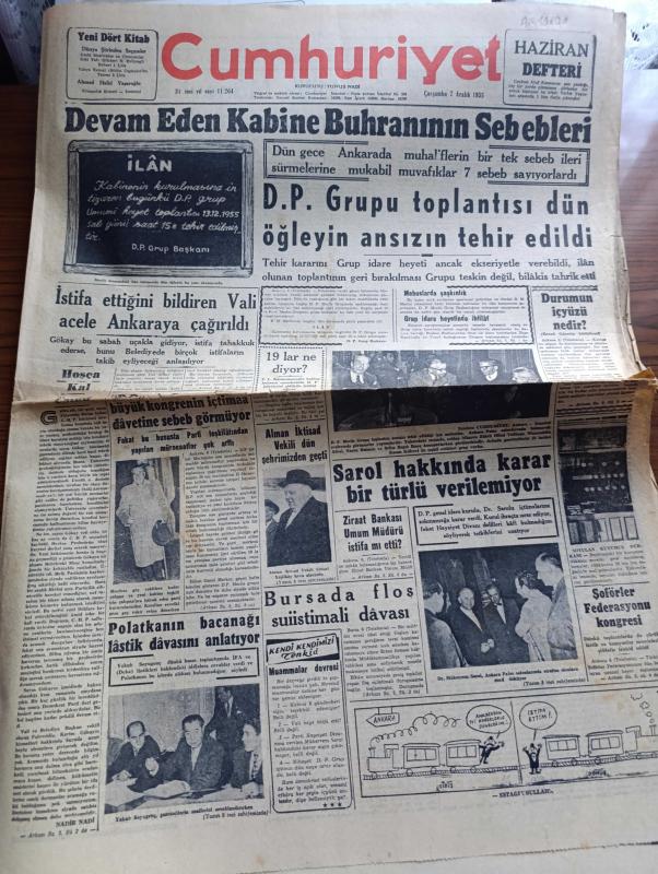 Cumhuriyet Gazetesi - 7 Aralık 1955 - Hoşça Kal yazan Nadir Nadi Başmakale - devam eden kabine buhranının sebepleri - Demokrat Parti grup toplantısı Dün öğleyin ansızın tehir edildi - istifa ettiğini bildiren Vali Fahrettin Kerim Gökay acele Ankara'ya çağrıldı - 19'lar ne diyor - Zühtü Hilmi Velibeşe Nizamettin Alisal Nazım Bezmen Ve Selim Ragıp Emeç Ankara palas salonunda fotoğraf - Doktor Mükerrem Sarol Ankara Palas salonlarında etrafını alanlara dert döküyor fotoğraf - Hasan Polatkan'ın bacanağı Yakup Soyugenç lastik davasını anlatıyor fotoğraf - şoförler Federasyonu Kongresi - AFL ve CİO birleşti dünyanın en büyük sendikası kuruldu - Malenkof sahneye çıkıyor mu - Cibali karakolunun birinci gecesi - olaylar ve alaylar yazan Burhan Felek - Şehir Tiyatrosu sanatçısı Yaşar Özsoy jübilesi bu akşam yapılıyor - Ayla Erduran Cemal Reşit Rey konseri - Milli Namzetler Beyoğlusporu 7 1 mağlup etti fotoğraf - milli futbol hakemleri dün lisanslarını aldılar - kız voleybol maçları, Yunus Nadi tarafından kaleme alınmıştır. Cumhuriyet Gazetesi - 7 Aralık 1955 - Hoşça Kal yazan Nadir Nadi Başmakale - devam eden kabine buhranının sebepleri - Demokrat Parti grup toplantısı Dün öğleyin ansızın tehir edildi - istifa ettiğini bildiren Vali Fahrettin Kerim Gökay acele Ankara'ya çağrıldı - 19'lar ne diyor - Zühtü Hilmi Velibeşe Nizamettin Alisal Nazım Bezmen Ve Selim Ragıp Emeç Ankara palas salonunda fotoğraf - Doktor Mükerrem Sarol Ankara Palas salonlarında etrafını alanlara dert döküyor fotoğraf - Hasan Polatkan'ın bacanağı Yakup Soyugenç lastik davasını anlatıyor fotoğraf - şoförler Federasyonu Kongresi - AFL ve CİO birleşti dünyanın en büyük sendikası kuruldu - Malenkof sahneye çıkıyor mu - Cibali karakolunun birinci gecesi - olaylar ve alaylar yazan Burhan Felek - Şehir Tiyatrosu sanatçısı Yaşar Özsoy jübilesi bu akşam yapılıyor - Ayla Erduran Cemal Reşit Rey konseri - Milli Namzetler Beyoğlusporu 7 1 mağlup etti fotoğraf - milli futbol hakemleri dün lisanslarını aldılar - kız voleybol maçları adlı eser Türkçe dilindedir.