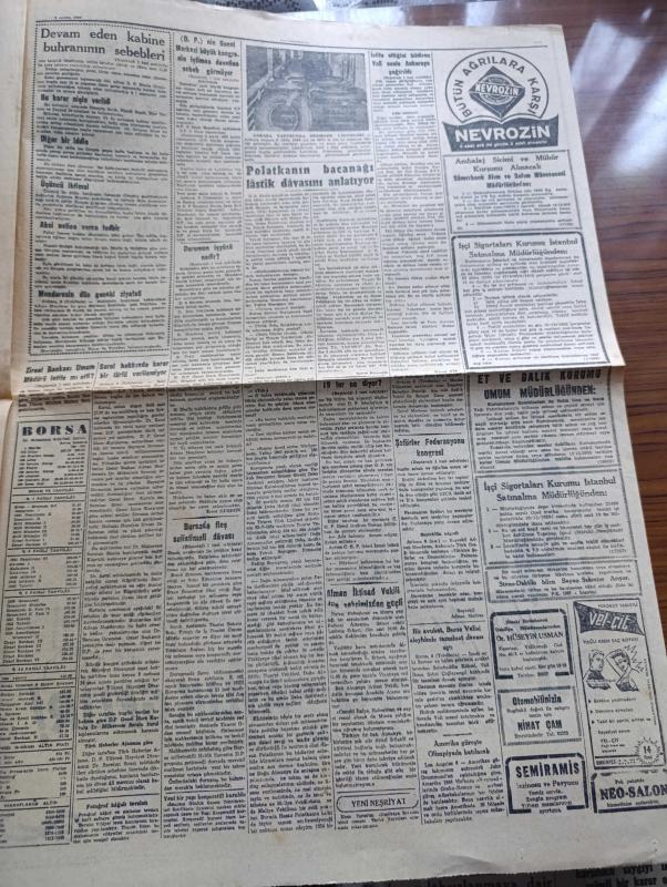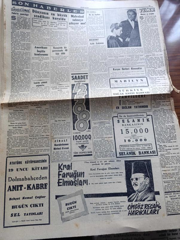 Cumhuriyet Gazetesi - 7 Aralık 1955 - Hoşça Kal yazan Nadir Nadi Başmakale - devam eden kabine buhranının sebepleri - Demokrat Parti grup toplantısı Dün öğleyin ansızın tehir edildi - istifa ettiğini bildiren Vali Fahrettin Kerim Gökay acele Ankara'ya çağrıldı - 19'lar ne diyor - Zühtü Hilmi Velibeşe Nizamettin Alisal Nazım Bezmen Ve Selim Ragıp Emeç Ankara palas salonunda fotoğraf - Doktor Mükerrem Sarol Ankara Palas salonlarında etrafını alanlara dert döküyor fotoğraf - Hasan Polatkan'ın bacanağı Yakup Soyugenç lastik davasını anlatıyor fotoğraf - şoförler Federasyonu Kongresi - AFL ve CİO birleşti dünyanın en büyük sendikası kuruldu - Malenkof sahneye çıkıyor mu - Cibali karakolunun birinci gecesi - olaylar ve alaylar yazan Burhan Felek - Şehir Tiyatrosu sanatçısı Yaşar Özsoy jübilesi bu akşam yapılıyor - Ayla Erduran Cemal Reşit Rey konseri - Milli Namzetler Beyoğlusporu 7 1 mağlup etti fotoğraf - milli futbol hakemleri dün lisanslarını aldılar - kız voleybol maçları adlı eser, Kitap > Süreli Yayınlar > Gazeteler > Türkiye > Genel > Günlük kategorisinde İkinci El olarak satıştadır.