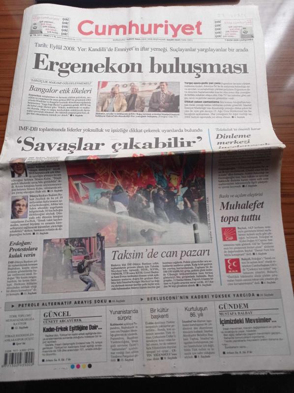 Cumhuriyet Gazetesi - 7 Ekim 2009 - Gökhan Ünal Saç Ektirdi Golü Unuttu - Taksim'de Can Pazarı - IMF Protestolarına Saldırı - Recep Tayyip Erdoğan Protestolara Kulak Verin - Baskı Ve Açılım Eleştirisi - Dinleme Merkezi İncelenecek - Tarih Eylül 2008 Kandillide Emniyetin İftar Yemeği Suçlayanlar Yargılayanlar Bir Arada Ergenekon Buluşması adlı eser, Kitap > Süreli Yayınlar > Gazeteler kategorisinde İkinci El olarak satıştadır.