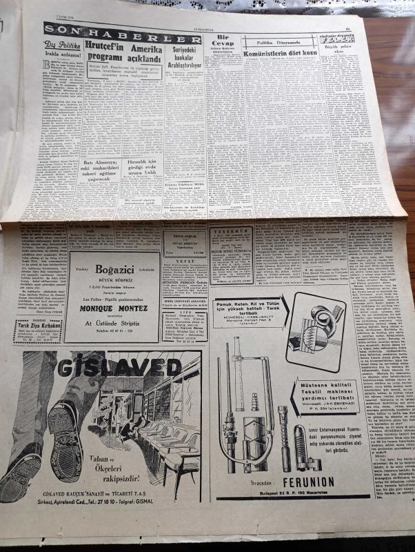 Cumhuriyet Gazetesi - 7 Eylül 1959 - Ankara Radyosu Müdürlüğüne Bir Cevap Yazan Nadir Nadi Köşe Yazısı - Demokrat Parti Milletvekili Fahri Ağaoğlu'nun Anayasanın Tadiline Dair Teklifinin Esasları - Bir Demokrat Parti Kongresinde Hadi Hüsman Tevfik İleri'den Bir Talepte Bulundu - OECE Heyetinin Ankara'daki Tetkiklerinin Neticeleri - Kıbrıs'ta Son 24 Saatte 2 Türk Daha Katledildi - Fatin Rüştü Zorlu Paris'ten Döndü - Tarihi Ertuğrul Yatı Kilosu 13 Kuruştan Hurdacıya Satıldı - Galatasaray Umumi Kaptanı Kadri Dağ'dan Futbol Seyircilerine Ders - Ortadirek Yazan Yaşar Kemal Yazı Dizisi - Kardeş Kavgası Yazan Hamdi Varoğlu - Sovyet Şefi Hrutçef'in Amerika Programı Açıklandı - Fransız Edebiyat Mükafatını Kazanan Şair Saint John Perse - Resimli Roman Azrail Der Ki Yazan Suat Taşer Resimleyen Hüseyin Mumcu - Koruyucu Melekler Çizgi Roman - Bay Oscar Karikatür - Profesör Nimbüs'ün Maceraları Çizgi Roman - Galatasaray Feriköy'ü Dünkü Maçta 3 0 Yendi - KYK İstanbul Yelken Şampiyonluğunu Kazandı adlı eser, Kitap > Süreli Yayınlar > Gazeteler > Türkiye > Genel > Günlük kategorisinde İkinci El olarak satıştadır.