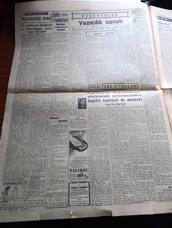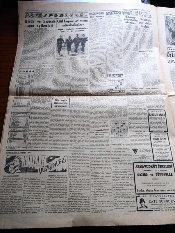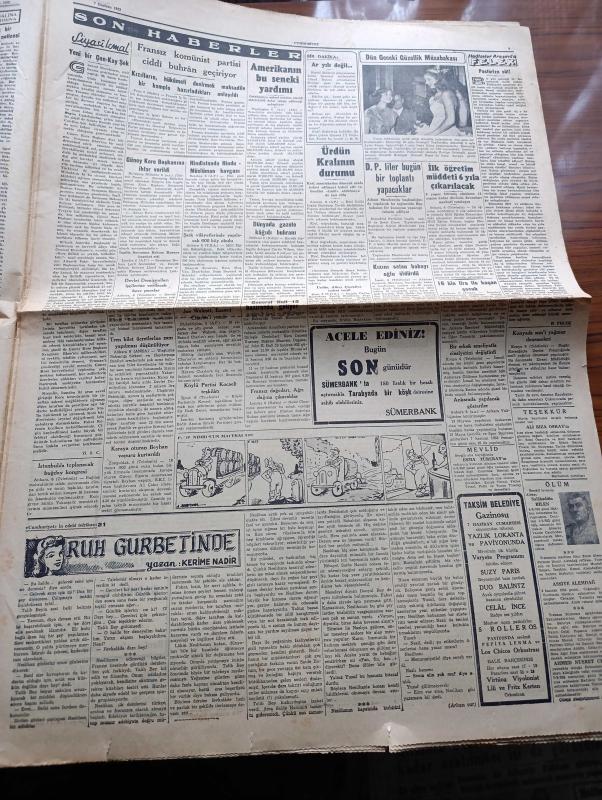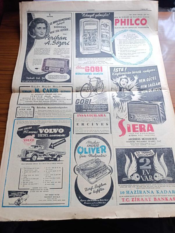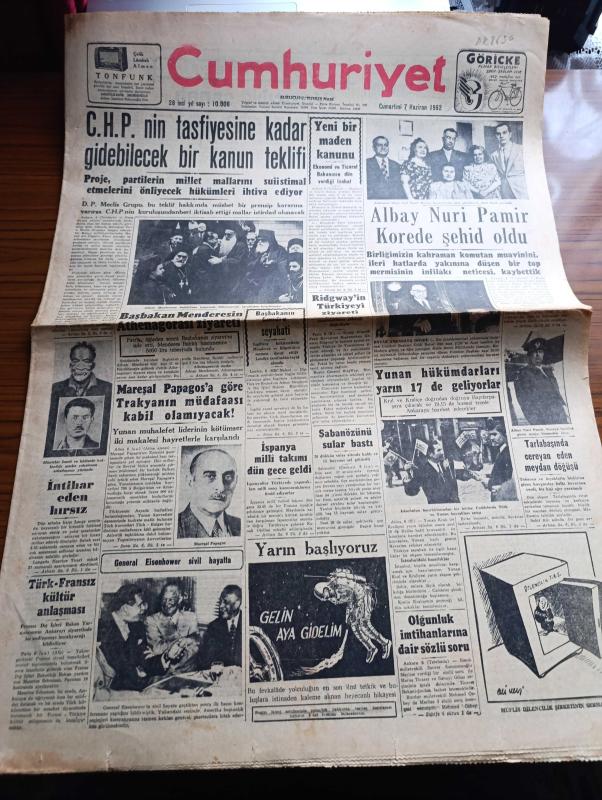 Cumhuriyet Gazetesi - 7 Haziran 1952 - CHP'nin Tasfiyesine Kadar Gidebilecek Bir Kanun Teklifi - Başbakan Adnan Menderes'in Patrik Athenagoras'ı Ziyareti - Albay Nuri Pamir Kore'de Şehit Oldu Fotoğraf - Yunan Hükümdarları Yarın 17 de Geliyorlar - Kuzey Atlantik Paktı Kuvvetleri Başkomutanı General Ridgway'in Türkiye'yi Ziyareti - Mareşal Papagos'a Trakyanın Müdafaası Kabil Olmayacak - Türk Fransız Kültür Anlaşması - İspanya Futbol Milli Takımı Geldi - Gelin Aya Gidelim Yazan Tevfik Sadullah - Dün Geceki Güzellik Müsabakası Fotoğraf - Ruh Gurbetinde Yazan Kerime Nadir Yazı Dizisi - Konya'da Suni Yağmur Denemeleri - Hindistan'da Hindu Müslüman Kavgası - Gül Kupası Atletizm Müsabakaları - El Yazılarından Mana Çıkarma Sanatı Tıbbın Büyük Yardımcısı - Süreyya Plaj Gazinosu Maltepe - Movado Saatleri - Minerva Dikiş Makineleri - Perihan Altındağ Sözeri Siz Bana Gelmezseniz Siemens Beni Size Getirir Diyor - Volvo Diesel Kamyonları - Oliver Yazı Makineleri - Alman Gobi Bisiklet - Philco, Yunus Nadi tarafından kaleme alınmıştır. Cumhuriyet Gazetesi - 7 Haziran 1952 - CHP'nin Tasfiyesine Kadar Gidebilecek Bir Kanun Teklifi - Başbakan Adnan Menderes'in Patrik Athenagoras'ı Ziyareti - Albay Nuri Pamir Kore'de Şehit Oldu Fotoğraf - Yunan Hükümdarları Yarın 17 de Geliyorlar - Kuzey Atlantik Paktı Kuvvetleri Başkomutanı General Ridgway'in Türkiye'yi Ziyareti - Mareşal Papagos'a Trakyanın Müdafaası Kabil Olmayacak - Türk Fransız Kültür Anlaşması - İspanya Futbol Milli Takımı Geldi - Gelin Aya Gidelim Yazan Tevfik Sadullah - Dün Geceki Güzellik Müsabakası Fotoğraf - Ruh Gurbetinde Yazan Kerime Nadir Yazı Dizisi - Konya'da Suni Yağmur Denemeleri - Hindistan'da Hindu Müslüman Kavgası - Gül Kupası Atletizm Müsabakaları - El Yazılarından Mana Çıkarma Sanatı Tıbbın Büyük Yardımcısı - Süreyya Plaj Gazinosu Maltepe - Movado Saatleri - Minerva Dikiş Makineleri - Perihan Altındağ Sözeri Siz Bana Gelmezseniz Siemens Beni Size Getirir Diyor - Volvo Diesel Kamyonları - Oliver Yazı Makineleri - Alman Gobi Bisiklet - Philco adlı eser Türkçe dilindedir.