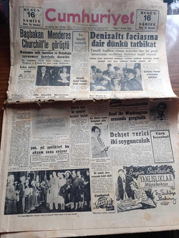 Cumhuriyet Gazetesi - 7 Haziran 1953 - Balkan müdafaa cephesi Cumhuriyet Başmakale - Başbakan Adnan Menderes Churchill ile görüştü - Dışişleri bakanımız Fuat Köprülü Bayan Jeffrey Me Dernott ile Riolto sinemasına giderken fotoğraf - denizaltı faciasına dair dünkü tatbikat - gündüz yapılan tatbikat sırasında Naboland ve Dumlupınar süvarileri fotoğraf - Ömer Dikmen ve Kenan Yıldız'ın Amerika'daki güreşleri - hür fikirleri yayma cemiyetinin yıllık Kongresi - Everest fatihlerine mükafatlar - İstanbul'un fethinin 500. Yılı şenlikleri bu akşam sona eriyor - Dolmabahçe sarayı'nda verilen garden partide mehter takımı ve bir kısım davetliler fotoğraf - pazar konuşmaları yazan Bedri Rahmi Eyüboğlu - 1953 güzellik müsabakası Nermin Gürsever fotoğraf - Cennet Yolu yazan Steinbeck Yazı Dizisi - bahar kupası atletizm müsabakaları - Mefharet Yıldırım Şükran Özer Abdullah Yüce Saime Sinan Cağaloğlu Çiftesaraylar bahçesinde - 174 bin lira kazanan yarış atı Tom Fool - komedi tiyatrosunda orta oyunu, Yunus Nadi tarafından kaleme alınmıştır. Cumhuriyet Gazetesi - 7 Haziran 1953 - Balkan müdafaa cephesi Cumhuriyet Başmakale - Başbakan Adnan Menderes Churchill ile görüştü - Dışişleri bakanımız Fuat Köprülü Bayan Jeffrey Me Dernott ile Riolto sinemasına giderken fotoğraf - denizaltı faciasına dair dünkü tatbikat - gündüz yapılan tatbikat sırasında Naboland ve Dumlupınar süvarileri fotoğraf - Ömer Dikmen ve Kenan Yıldız'ın Amerika'daki güreşleri - hür fikirleri yayma cemiyetinin yıllık Kongresi - Everest fatihlerine mükafatlar - İstanbul'un fethinin 500. Yılı şenlikleri bu akşam sona eriyor - Dolmabahçe sarayı'nda verilen garden partide mehter takımı ve bir kısım davetliler fotoğraf - pazar konuşmaları yazan Bedri Rahmi Eyüboğlu - 1953 güzellik müsabakası Nermin Gürsever fotoğraf - Cennet Yolu yazan Steinbeck Yazı Dizisi - bahar kupası atletizm müsabakaları - Mefharet Yıldırım Şükran Özer Abdullah Yüce Saime Sinan Cağaloğlu Çiftesaraylar bahçesinde - 174 bin lira kazanan yarış atı Tom Fool - komedi tiyatrosunda orta oyunu adlı eser Türkçe dilindedir.