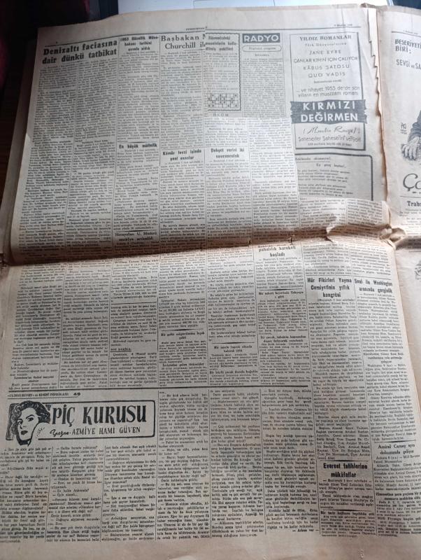 Cumhuriyet Gazetesi - 7 Haziran 1953 - Balkan müdafaa cephesi Cumhuriyet Başmakale - Başbakan Adnan Menderes Churchill ile görüştü - Dışişleri bakanımız Fuat Köprülü Bayan Jeffrey Me Dernott ile Riolto sinemasına giderken fotoğraf - denizaltı faciasına dair dünkü tatbikat - gündüz yapılan tatbikat sırasında Naboland ve Dumlupınar süvarileri fotoğraf - Ömer Dikmen ve Kenan Yıldız'ın Amerika'daki güreşleri - hür fikirleri yayma cemiyetinin yıllık Kongresi - Everest fatihlerine mükafatlar - İstanbul'un fethinin 500. Yılı şenlikleri bu akşam sona eriyor - Dolmabahçe sarayı'nda verilen garden partide mehter takımı ve bir kısım davetliler fotoğraf - pazar konuşmaları yazan Bedri Rahmi Eyüboğlu - 1953 güzellik müsabakası Nermin Gürsever fotoğraf - Cennet Yolu yazan Steinbeck Yazı Dizisi - bahar kupası atletizm müsabakaları - Mefharet Yıldırım Şükran Özer Abdullah Yüce Saime Sinan Cağaloğlu Çiftesaraylar bahçesinde - 174 bin lira kazanan yarış atı Tom Fool - komedi tiyatrosunda orta oyunu adlı eser, Kitap > Süreli Yayınlar > Gazeteler > Türkiye > Genel > Günlük kategorisinde İkinci El olarak satıştadır.