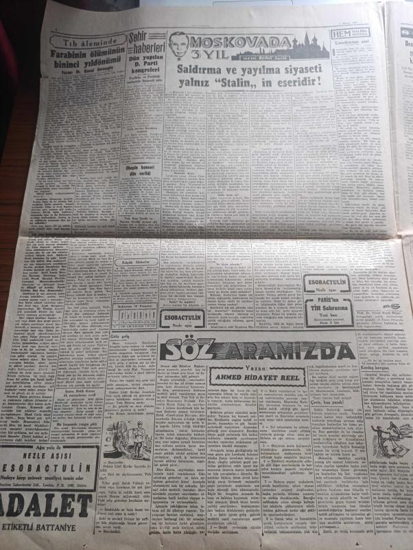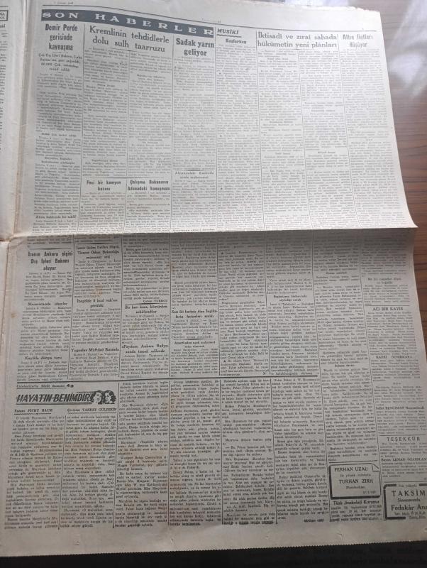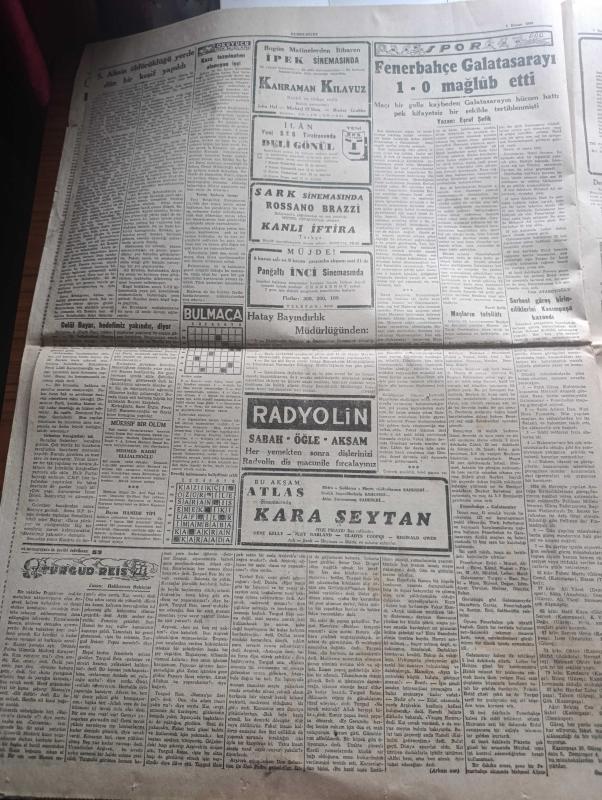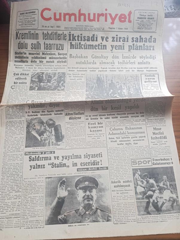 Cumhuriyet Gazetesi - 7 Kasım 1949 - çok dikkat edilecek bir nokta Cumhuriyet Başmakale - Sabahattin Ali'nin öldürüldüğü yerde Dün bir keşif yapıldı - Ali Ertekin Sabahattin Ali'yi öldürdüğü yerde oturuyor fotoğraf - kremlin'in tehditlerle dolu sulh taarruzu - Sovyet politbürosundan Malenkov Molotov Voroşilov Ve Stalin bir merasimi seyrederken fotoğraf - Demokrat Parti başkanı Celal Bayar hedefimiz yakındır diyor - Çalışma Bakanı Reşad Şemsettin Sirer'in Adana'daki konuşması - Fenerbahçe 1 Galatasaray 0 fotoğraf - askerlik müddeti azaltılmayacak - Moskova'da 3 yıl yazan Bedell Smith Yazı Dizisi - Farabinin ölümünün bininci yıldönümü yazan doktor Kemal Saraçoğlu - Chopin konseri Dün verildi - Turgut Reis yazan Halikarnas Balıkçısı Yazı Dizisi - Kara şeytan filmi Atlas sinemasında - yeni ses tiyatrosunda Deli Gönül - serbest güreş birinciliklerini Kasımpaşa kazandı - Perihan Altındağ Sözeri Ve İsmail Dümbüllü bu akşam Kadıköy Süreyya sinemasında - Dram kısmında Faust oyunu - Philips adlı eser, Kitap > Süreli Yayınlar > Gazeteler > Türkiye > Genel > Günlük kategorisinde İkinci El olarak satıştadır.